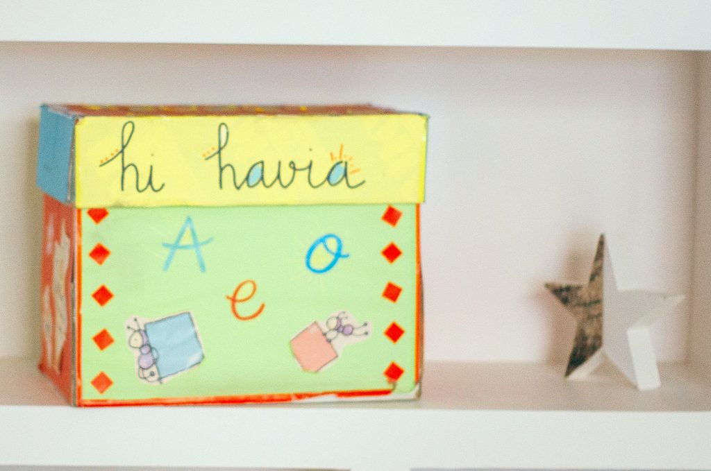- Después realizamos la dinámica de la Caja de los Cuentos. Se trata de una caja (os mostramos una imagen de la nuestra) que contiene: frases de inicio (Había una vez…), frases de final (colorín, colorado…) y tarjetas con ingredientes (dragones, príncipes, castillos, islas…). Para favorecer su imaginación, les pedimos a los alumnos y alumnas que cogieran tres ingredientes, y que a partir de ellos elaborasen su cuento. Os aseguramos, que independientemente del nivel, el dar esos tres ingredientes, les facilita mucho la tarea y les motiva.