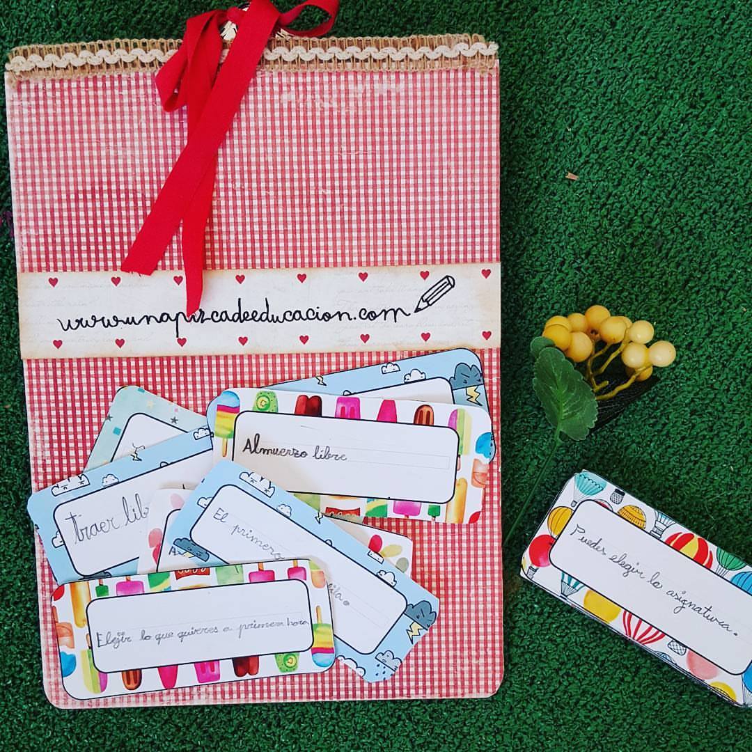 El curso pasado nosotras redactamos los cupones recompensa, preguntamos sus gustos, sus motivaciones… y como no sabían escribir nosotras le pusimos texto a los cupones. Nuestros cupones estaban colgados en un lugar visible en la clase. Los escondimos dentro de unos sobres hechos con goma eva y adornados con gomets. Ellos mismos escogían la recompensa cuando la conseguían.