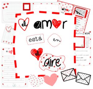 Nosotras tenemos pensado formar un corazón con los sobres que haremos como manualidad (os lo explicamos después). Los utilizaremos para que los alumnos y alumnas se escriban mensajes. Usaremos el cartel el amor está en el aire para completar la decoración. Nosotras lo imprimiremos en A3, pero eso va al gusto. Os dejamos muestra de lo que tenemos pensado.