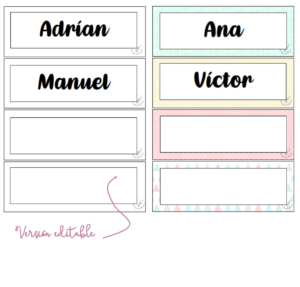 - Carteles editables para escribir el nombre de tu alumnado: antes de imprimir completa los carteles con los nombres de tus alumn@s. Luego imprime, recorta y plastifica (opcional). En los carteles editables facilitamos dos opciones: con fondo o sin fondo para que los alumn@s lo decoren a su gusto.