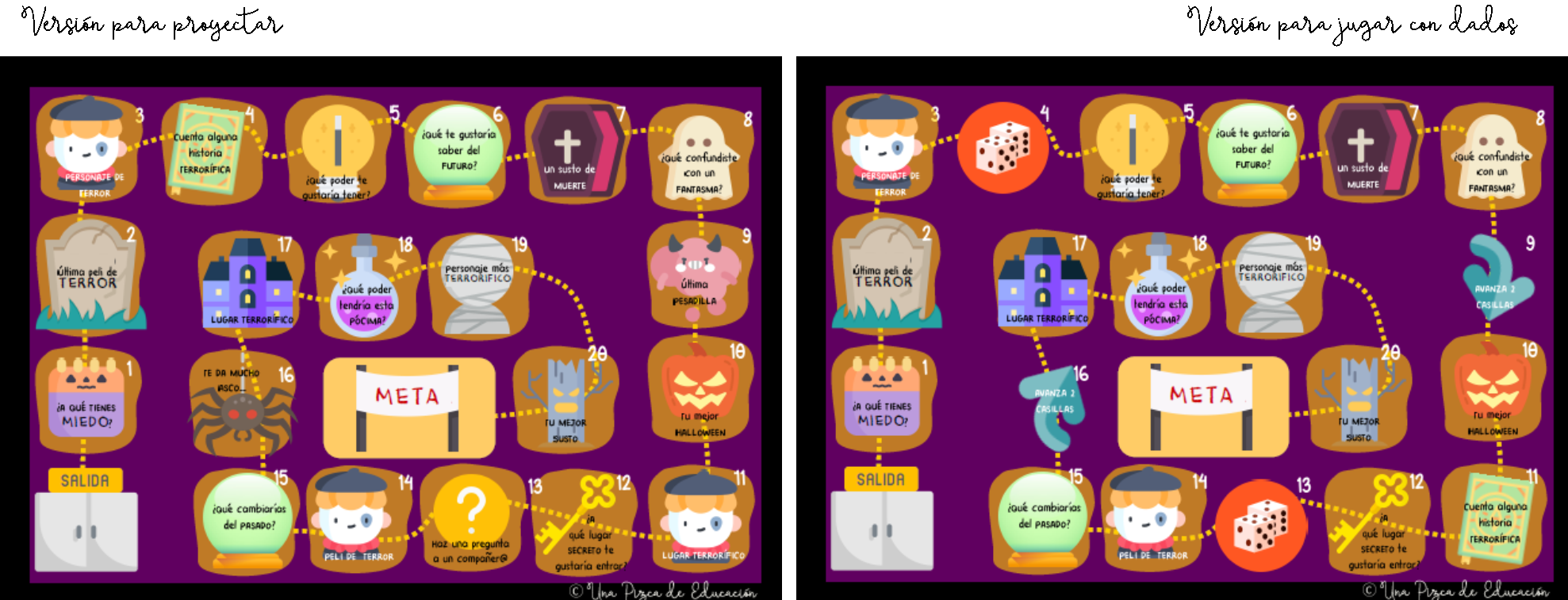 Se trata de unos tableros de juegos para estimular la expresión oral y pasar un buen rato con temática de Halloween. En cada casilla se encontrará un reto, una pregunta o propuesta relacionada con Halloween. Os proponemos dos variantes: una para jugar en pequeño grupo con dados y fichas, y otra para proyectar en vuestra PDI. Lo ideal es que si optáis por la versión impresa lo hagáis a todo color y en formato a3.