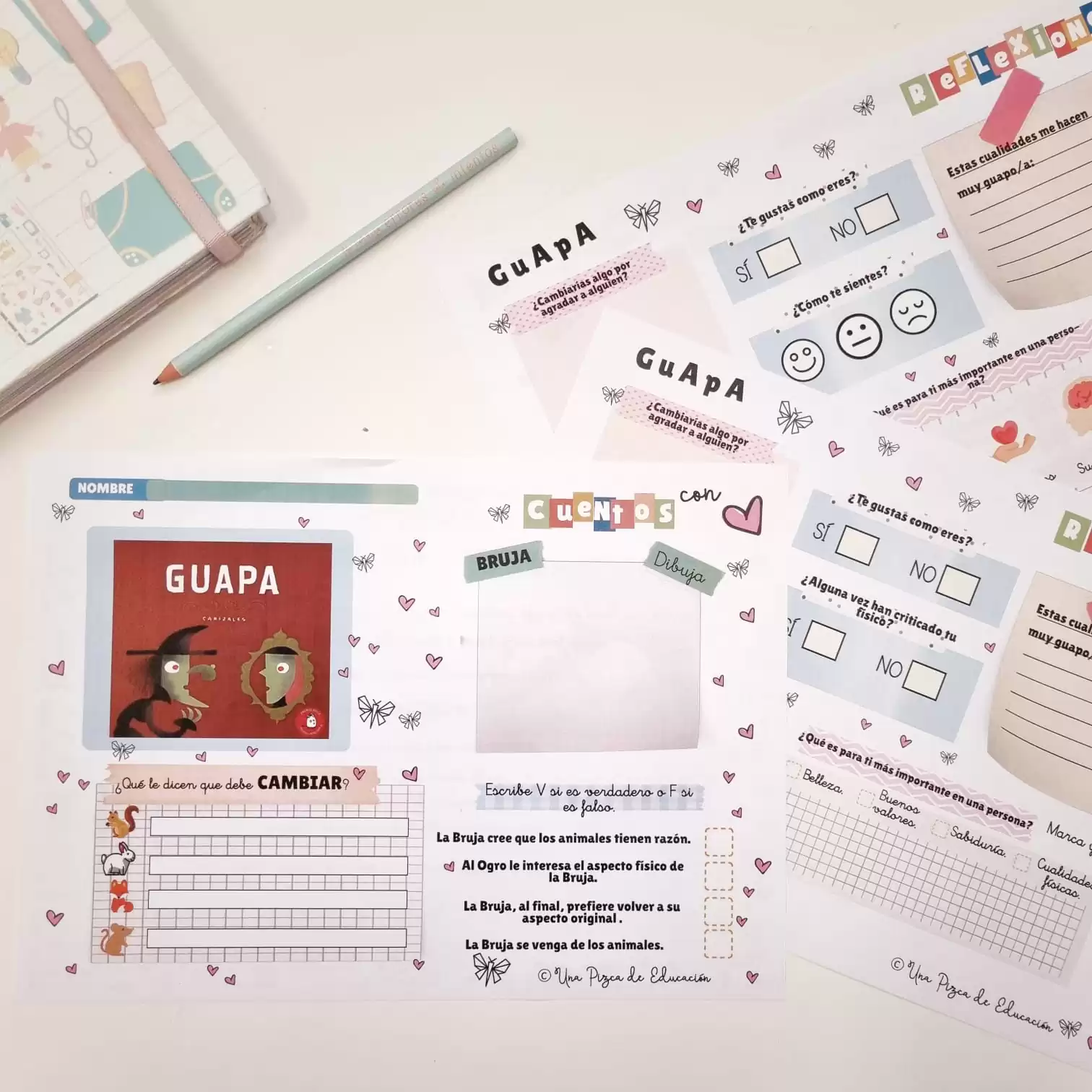 Nos encantan los cuentos y leerlos a nuestro alumnado todavía más. Solemos buscar cuentos que trabajen valores y que gracias a ellos podamos generar diálogo y reflexión sobre los mismos. Además de comentarlo, reforzamos su interiorización a través de fichas de reflexión. Ya hemos trabajado el famoso cuento Orejas de Mariposa y en este post os ofrecemos la ficha de un nuevo cuento que nos gusta mucho y a nuestro alumnado también: GUAPA.