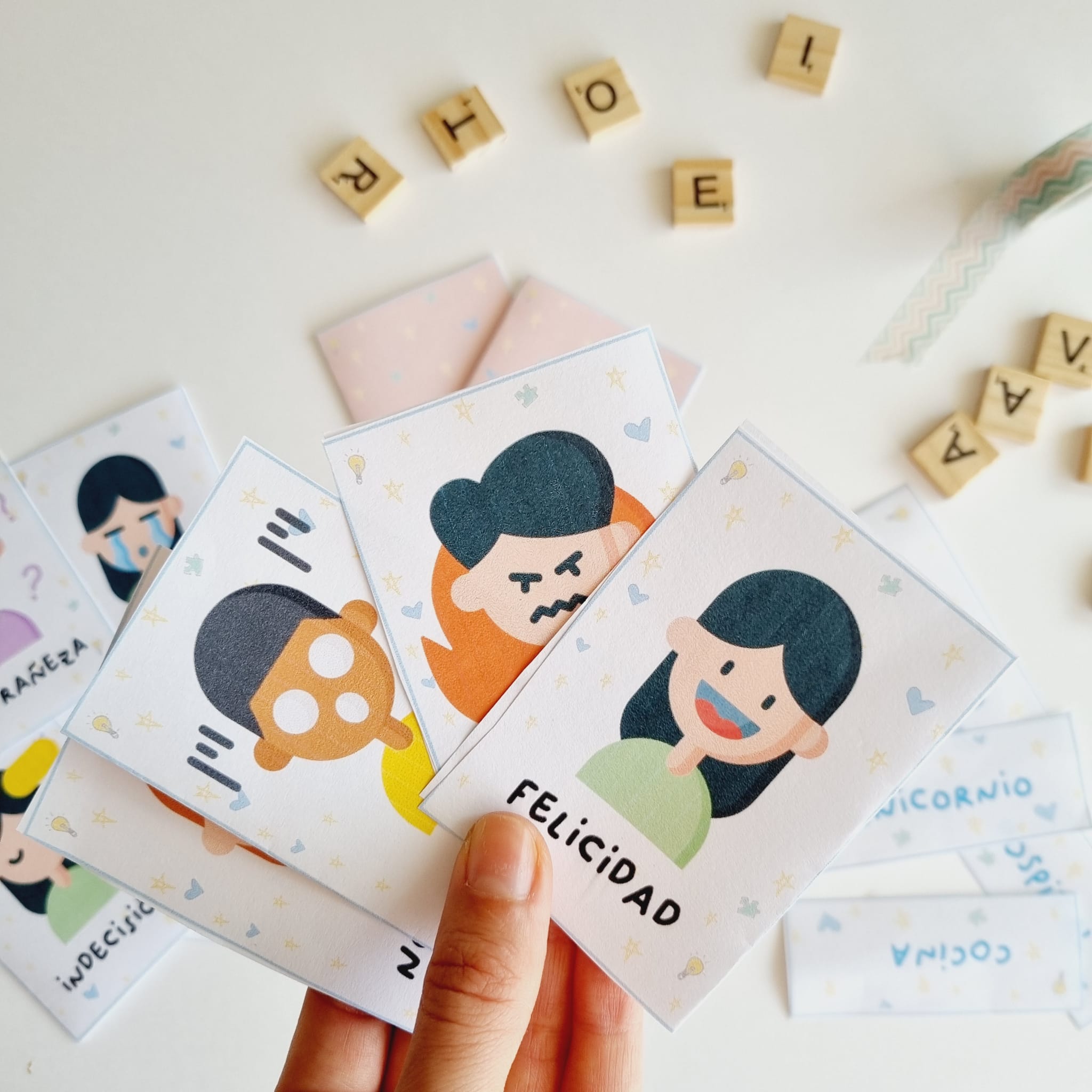 - 24 tarjetas con el nombre y dibujo de diferentes emociones (ira, alegría, asco, pánico, nerviosismo…). Todas ellas con su reverso para que queden en forma de cartas de juego.