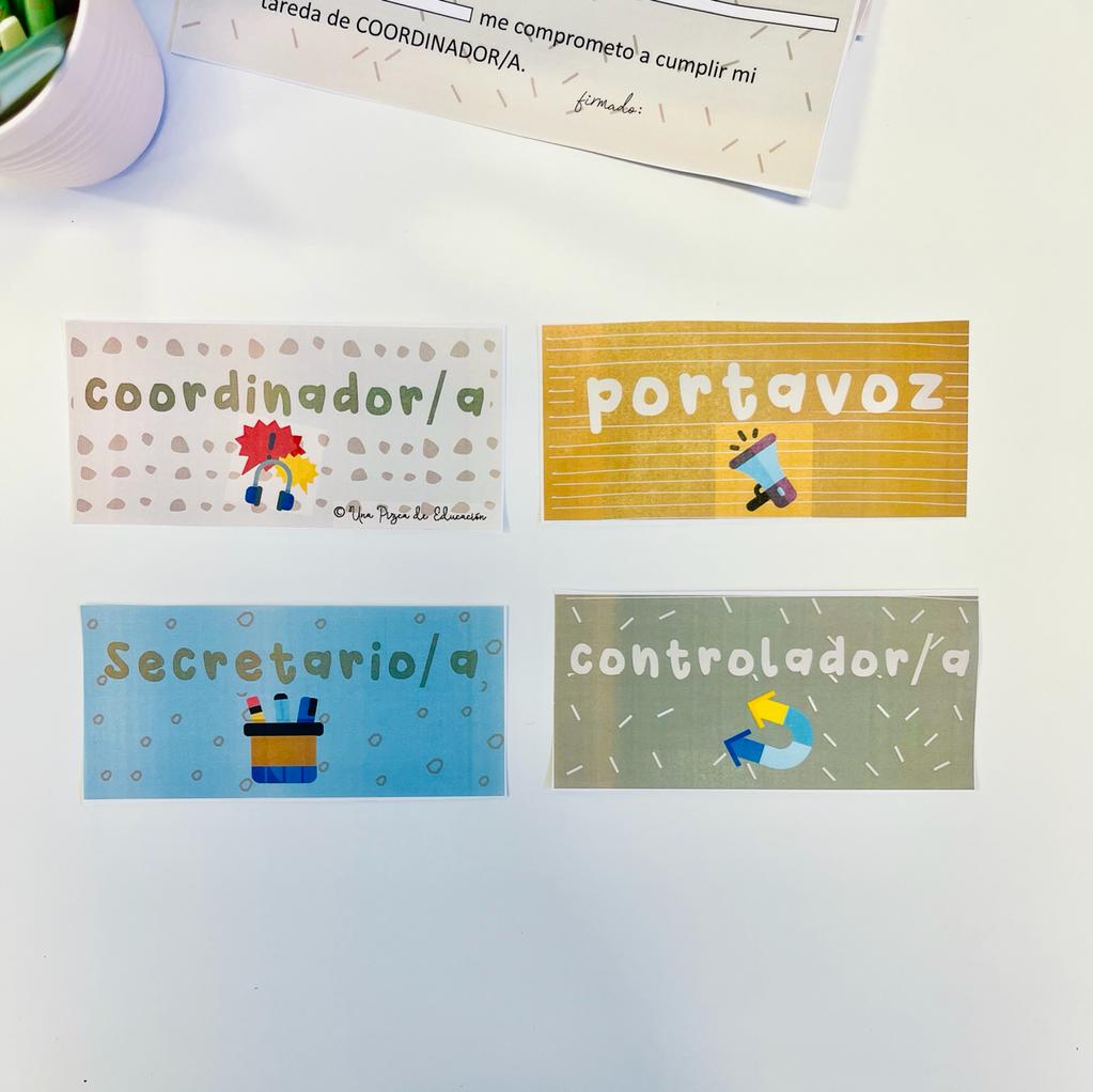 - carteles para las mesas con los roles: secretario/a, portavoz, coordinador/a y controlador/a