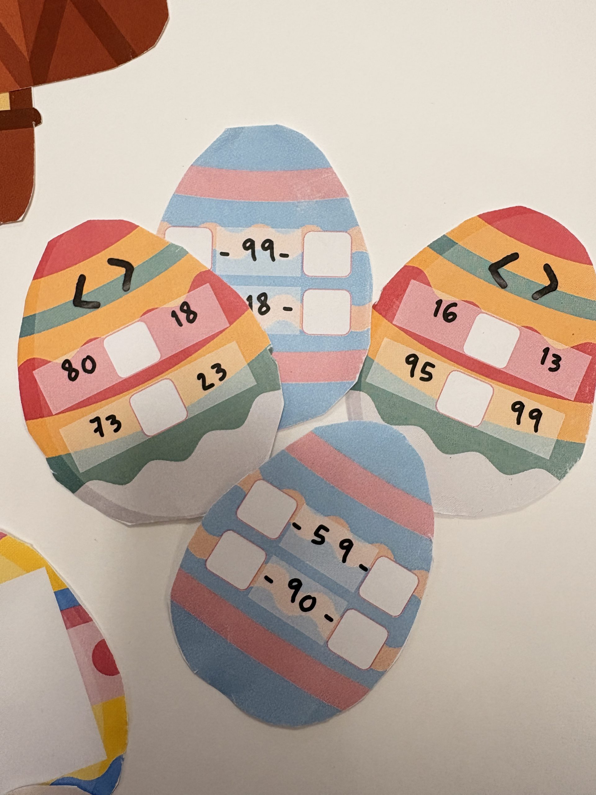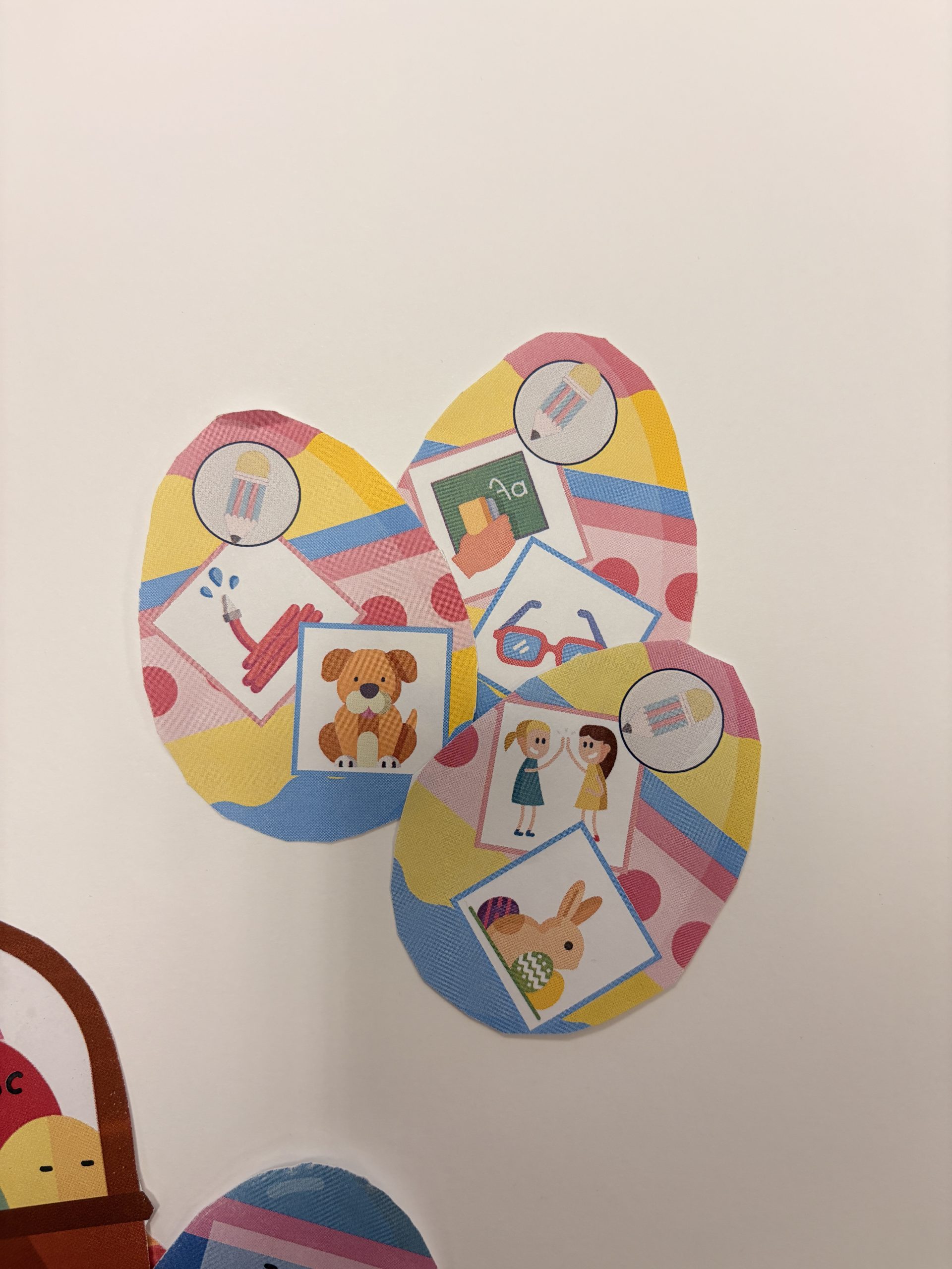 Cuando completan un huevo, buscan a la maestra, esta lo corrige y si está correcto les pega un gomet en su carnet/cesta. Terminan cuando han conseguido completar todas las pruebas de su cesta correctamente. Si se queda corto, siempre podéis dar más cestas y motivarlos para ver cuántas cestas consiguen completar.