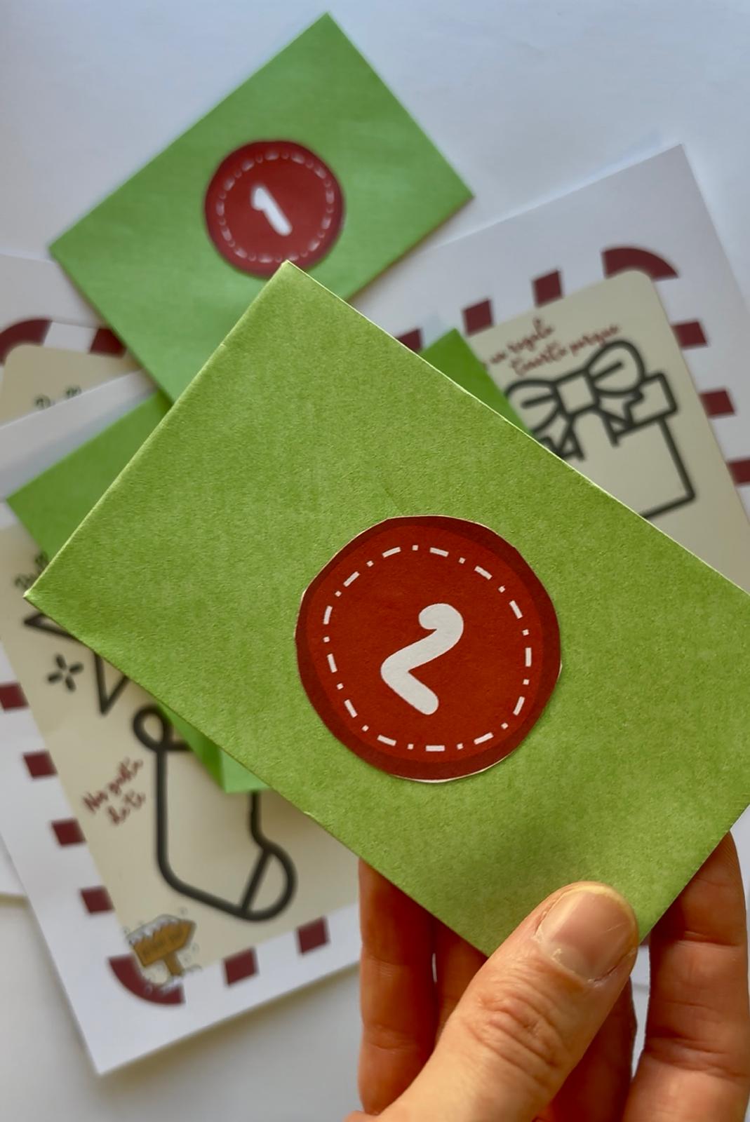 Imprime los números del 1 al 24 y pega cada uno en un sobre diferente. Si tienes menos de 24 alumnos/as, como es nuestro caso, puedes colocar solo los números de sobre de los días que hay colegio.