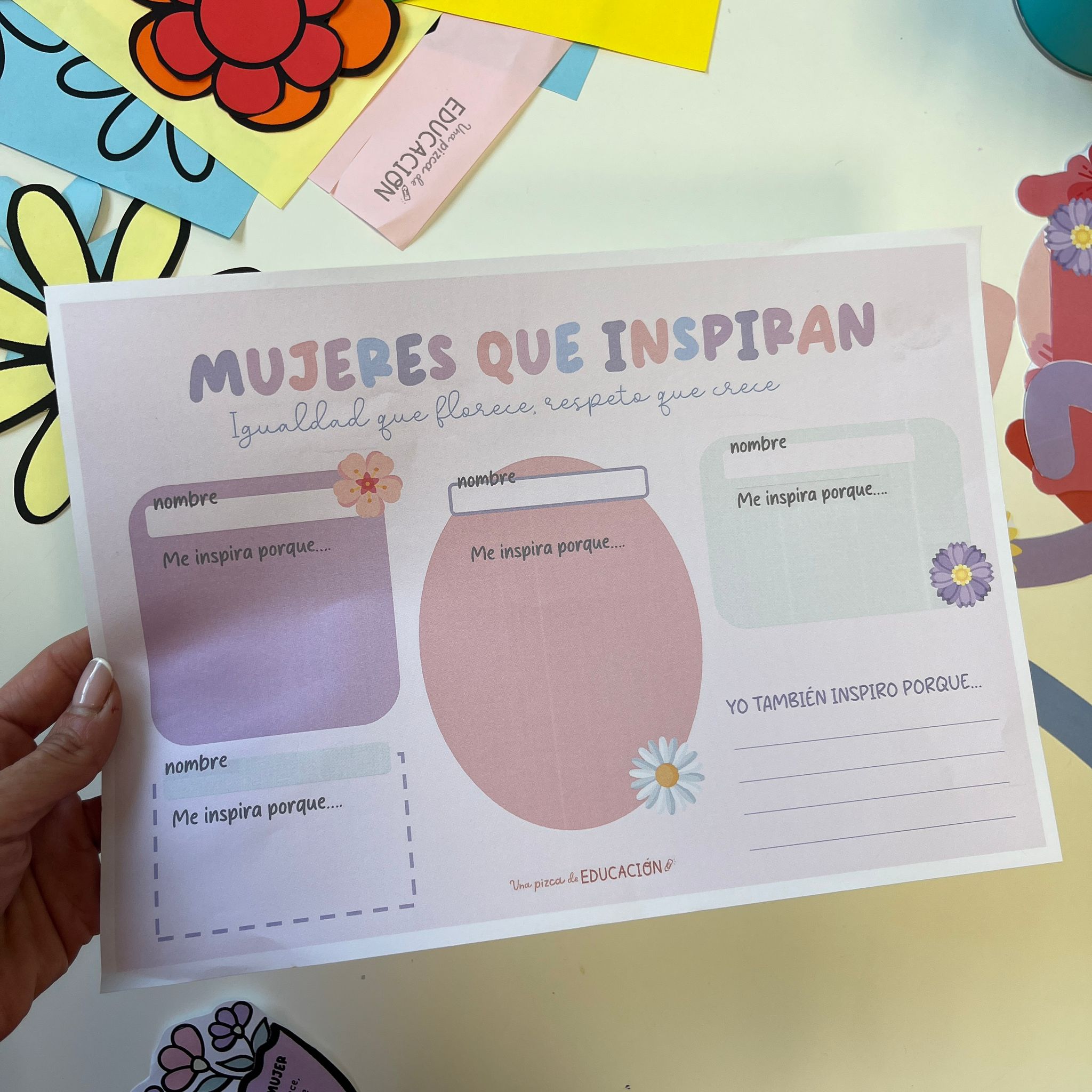 - Flores decorativas, para montarlas y escribir nombres de mujeres que inspiran.