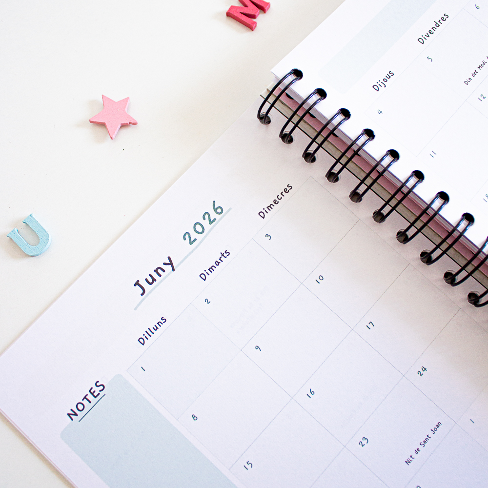 • Agenda por meses, con organización a semana vista de septiembre de 2025 a agosto de 2026 (curso escolar).