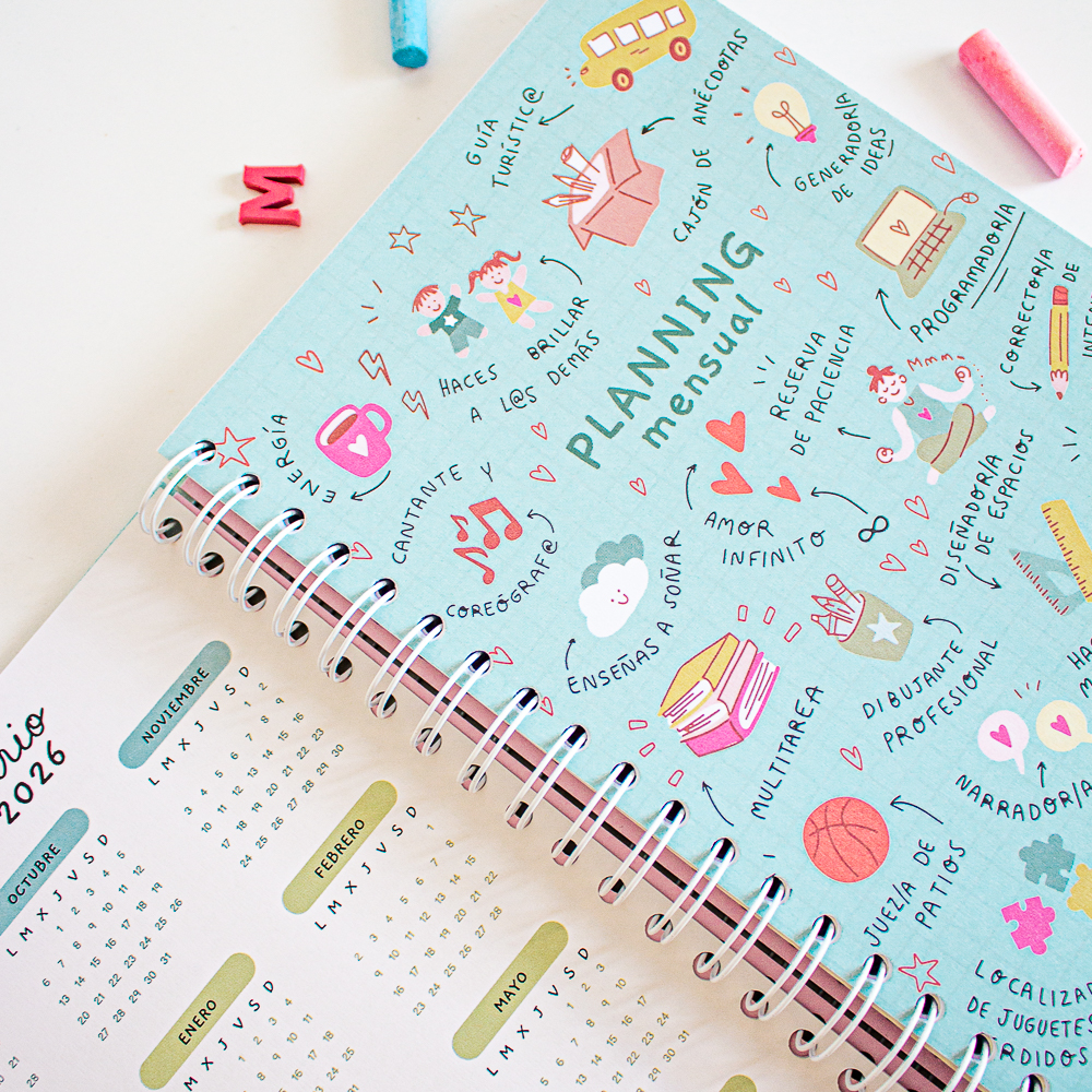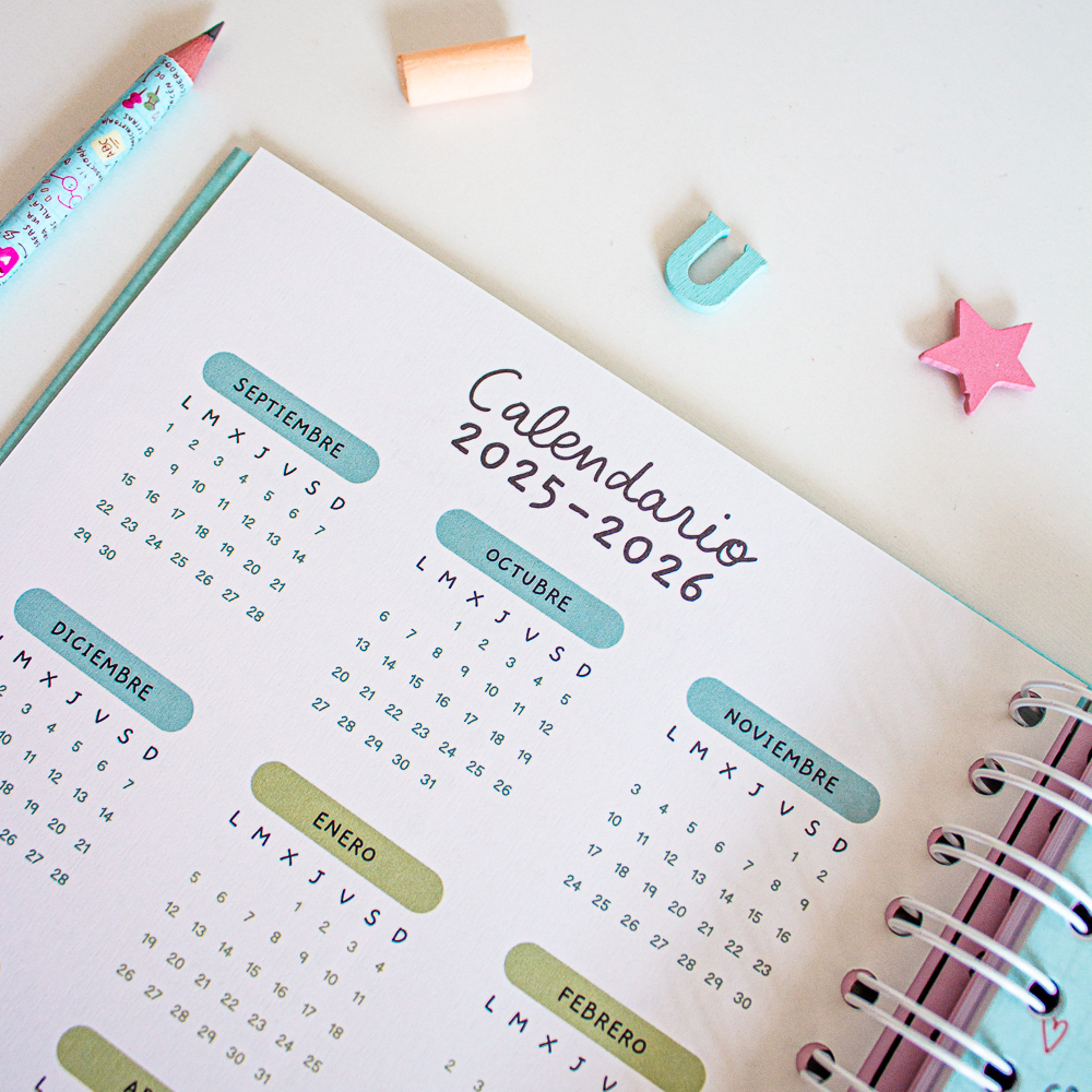 - Agenda por meses, con organización a semana vista de septiembre de 2025 a agosto de 2026 (curso escolar).
