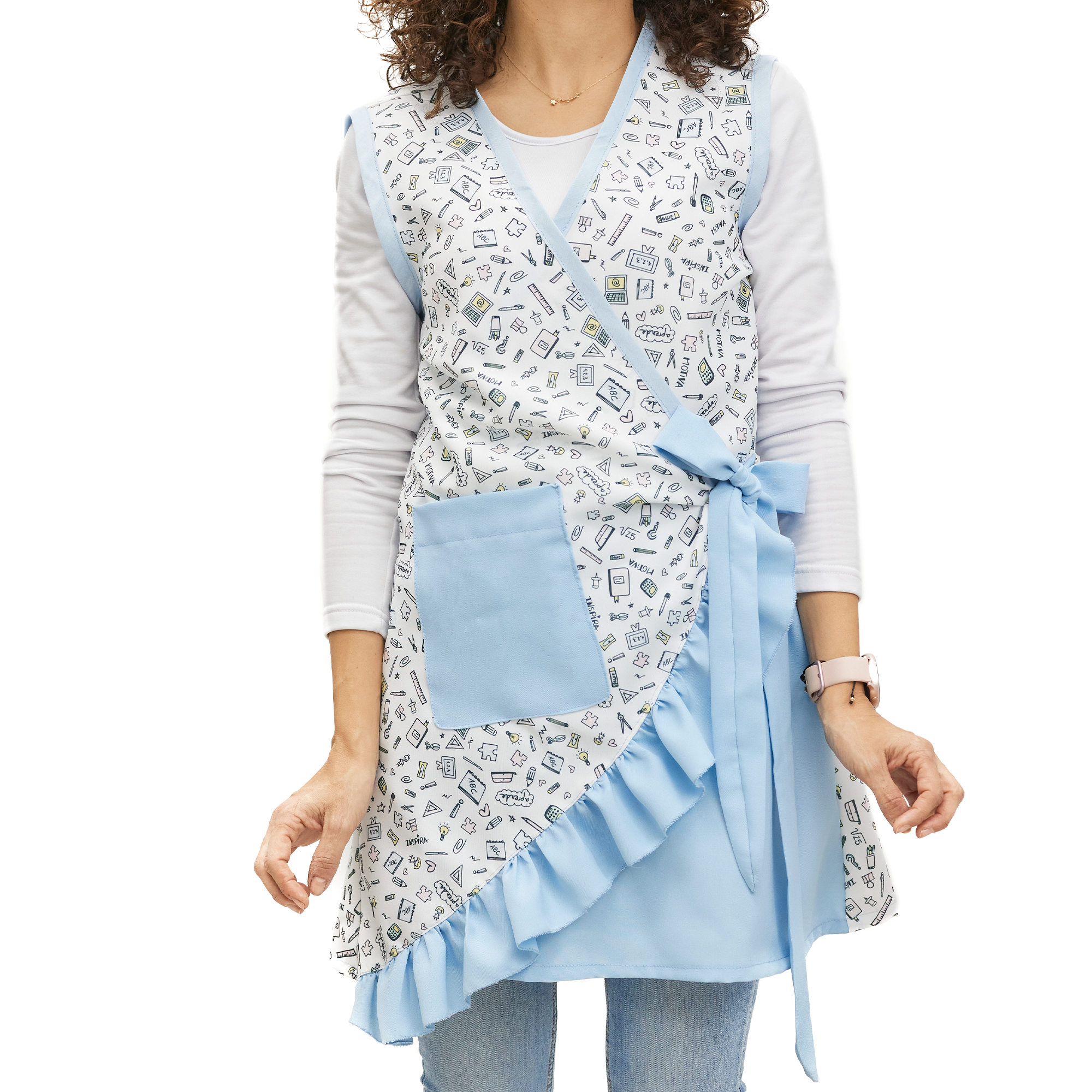 La bata para maestras de la colección inspira, motiva y aprende lleva el estampado de esta colección. Se combina con una tela lisa en tono azulado. Lleva un botón interior para ajustar y se abrocha con una lazada.