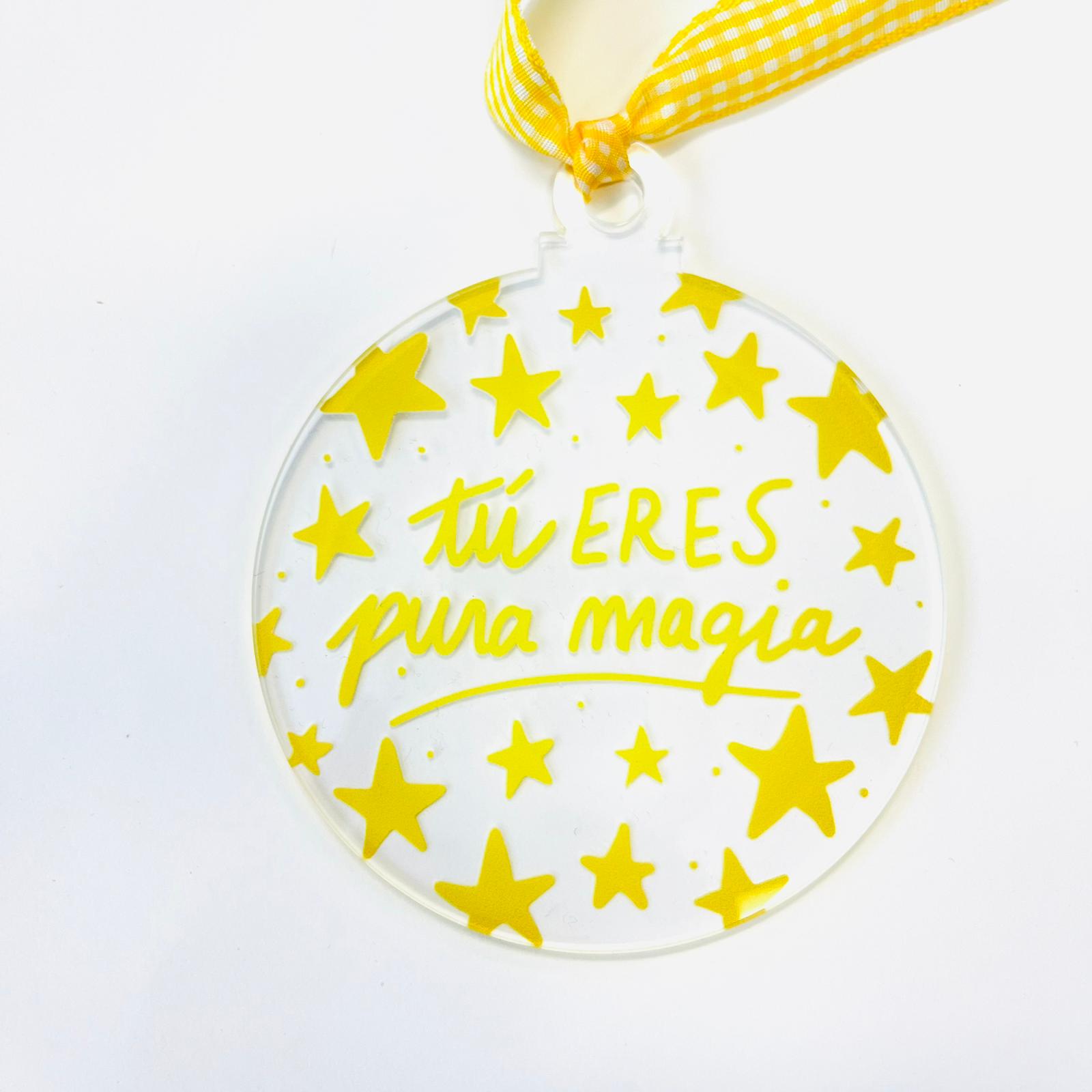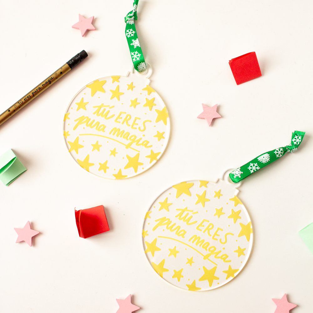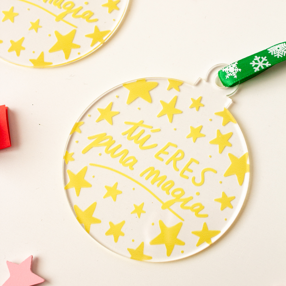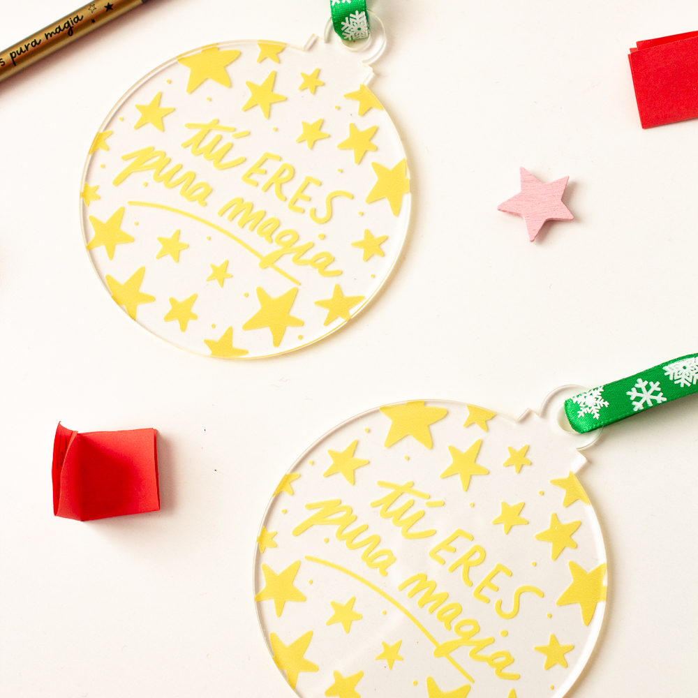 Esta bola de Navidad está hecha de metacrilato e impresa en color amarillo. Es el detalle perfecto para estas navidades: amigos invisibles, claustro de profes, alumnado…. un regalo sencillo pero que quedará genial colgado del árbol de Navidad.