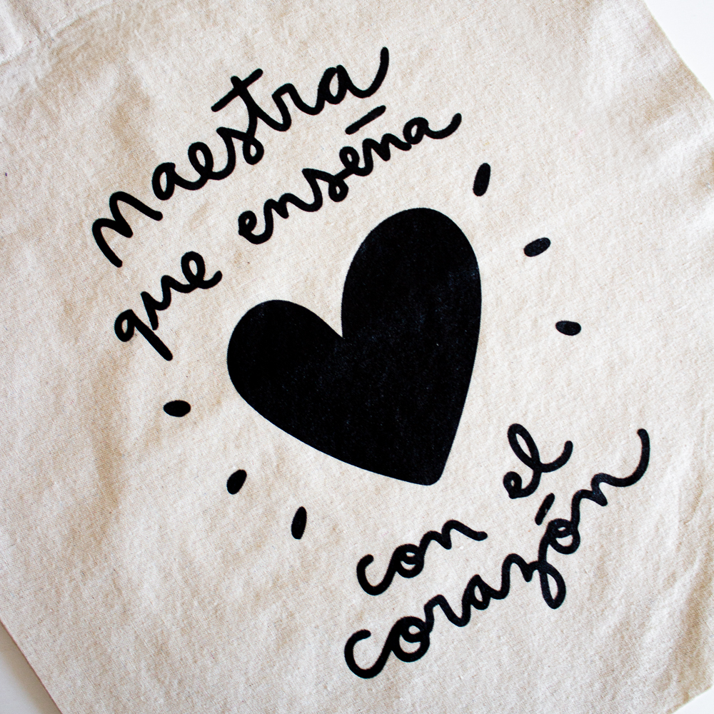 Bolso ideal para llevar todo lo que necesitas para el cole. Con un diseño único y especial, y la frase que nos encanta Maestra que enseña con corazón .