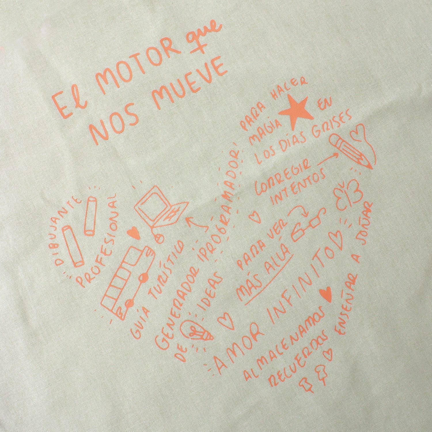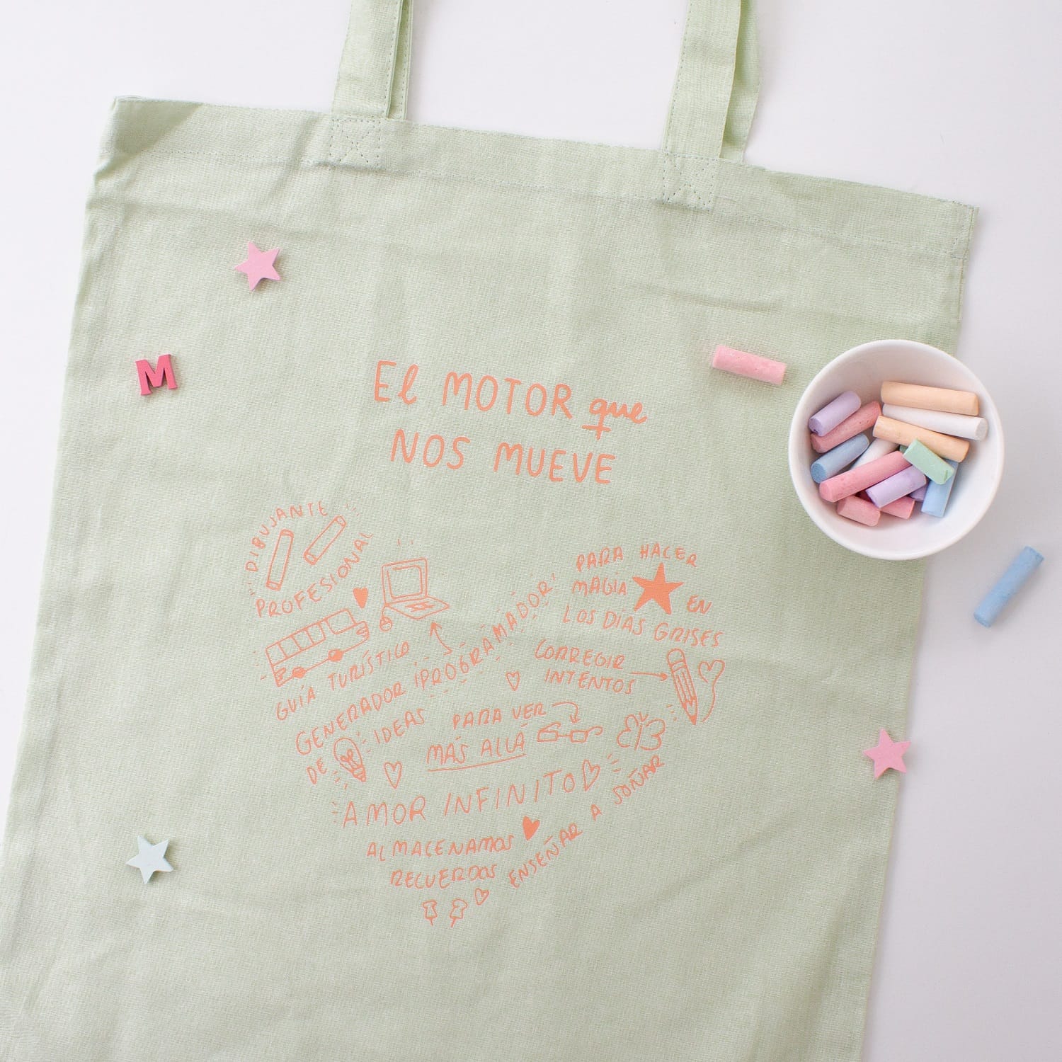 Bolso 100% de algodón orgánico ideal para llevar todo lo que necesitas para el cole. Incluye estampado un corazón, el motor que nos mueve, con un montón de palabras y frases que nos representan.