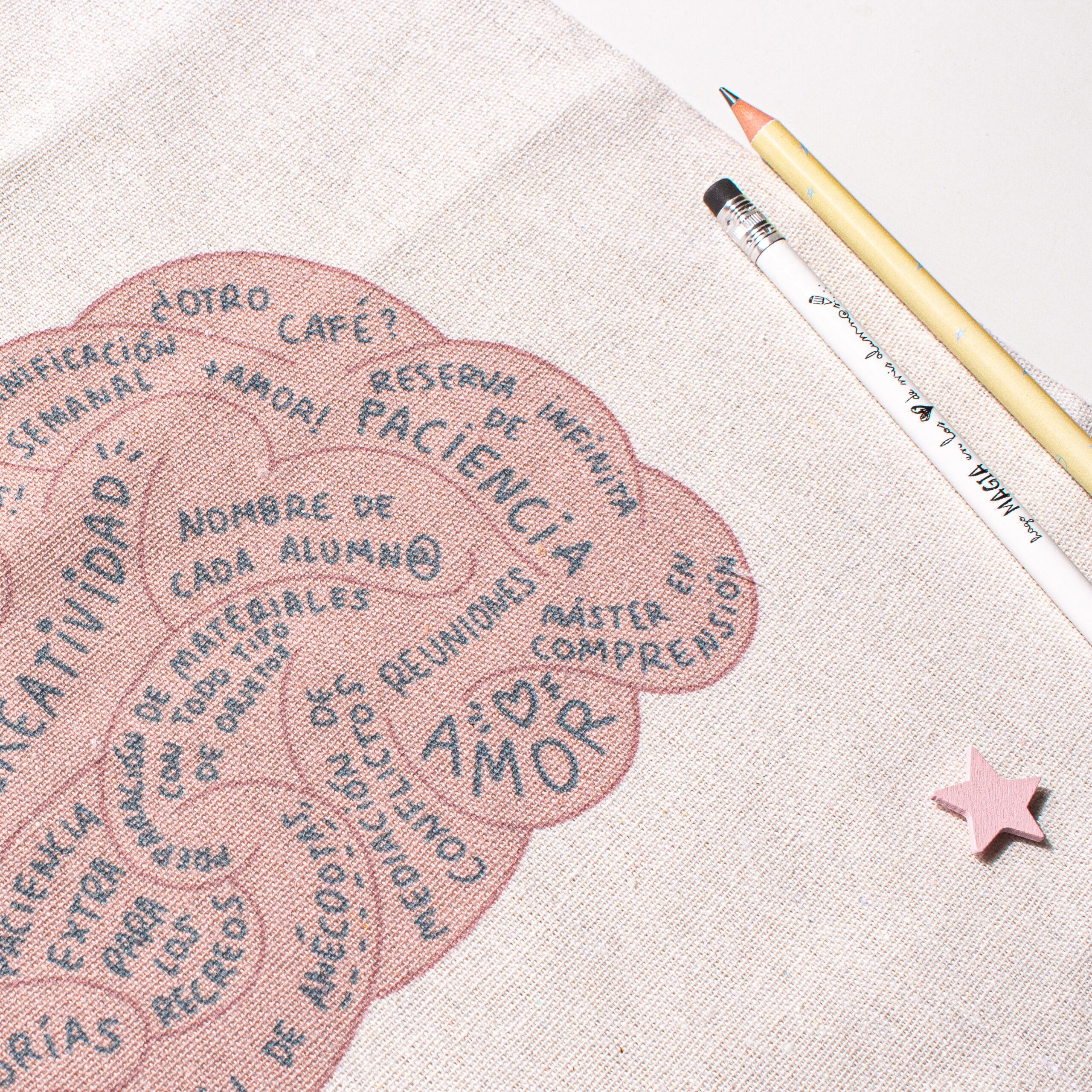 Bolso 100% de algodón orgánico ideal para llevar todo lo que necesitas para el cole. Incluye ilustración original con todas aquellas cosas que se cuecen dentro de la mente de un/a maestr@,  con un montón de palabras y frases que nos representan.