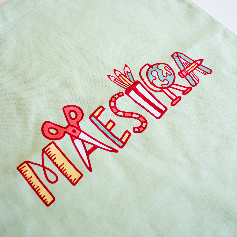 Bolso 100% de algodón orgánico ideal para llevar todo lo que necesitas para el cole. Con un diseño único y especial, y la palabra MAESTRA con dibujos que nos representan.