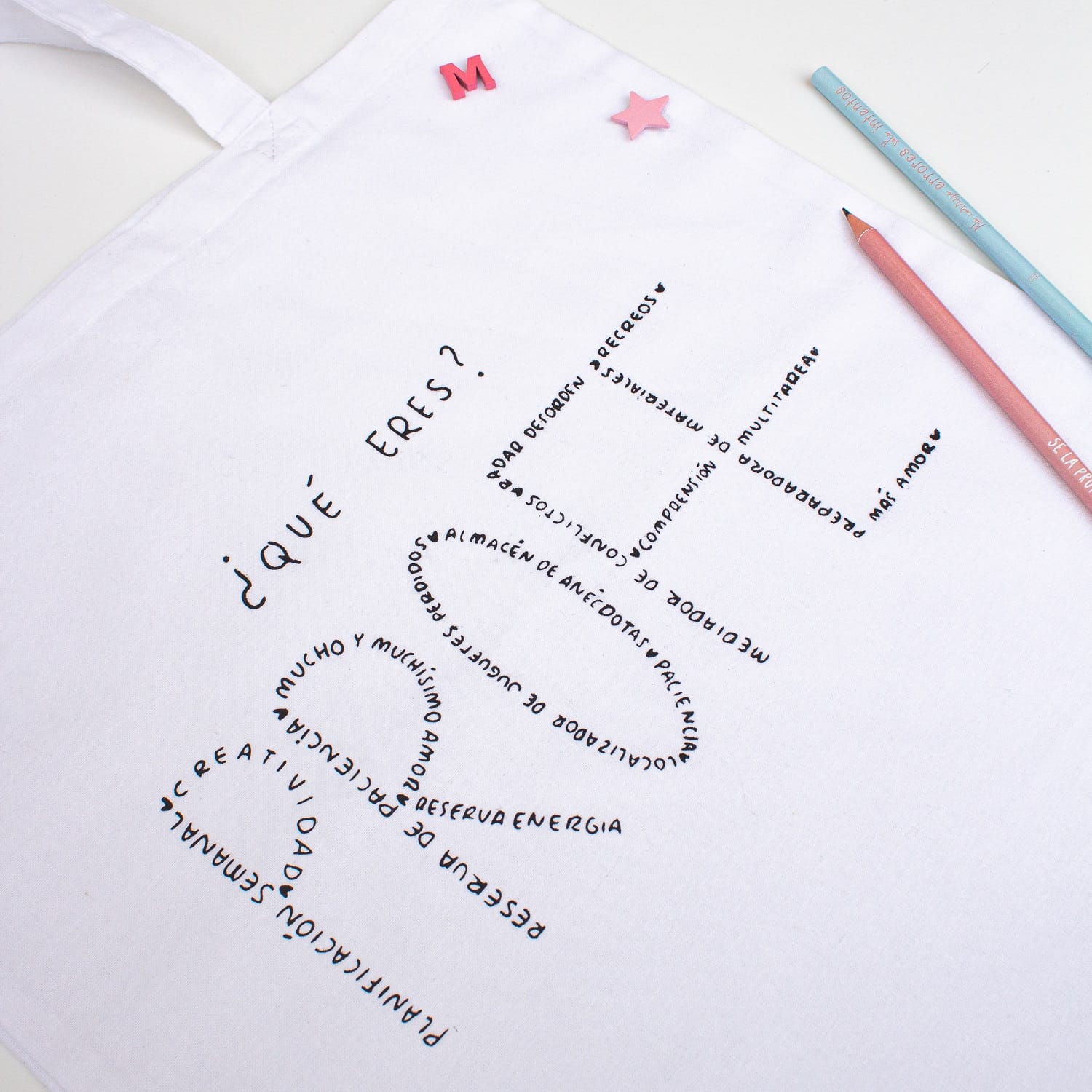 Bolso 100% de algodón orgánico ideal para llevar todo lo que necesitas para el cole. Incluye estampado la frase ¿Qué eres? PROFE.