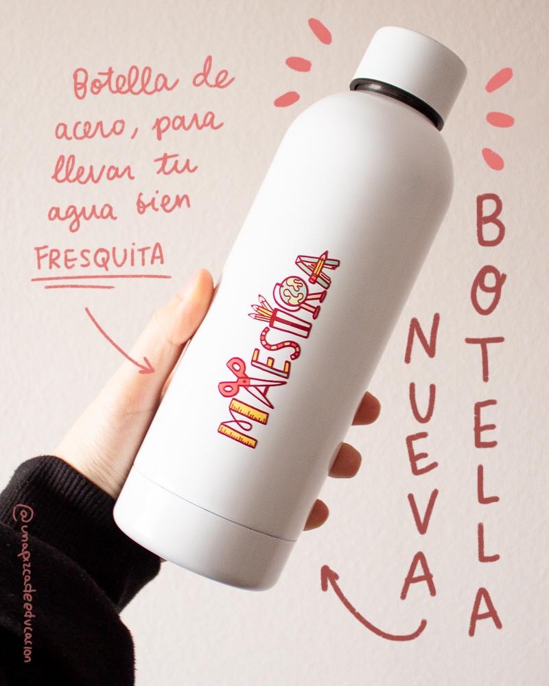 La botella MAESTRA es ideal para que no te quedes seca en tu día a día como maestra. Está fabricada en acero inoxidable reciclado y tiene una capacidad de 550ml.