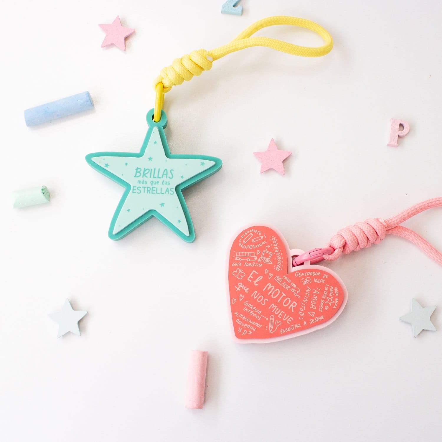 • Llavero fabricado en PVC gordito, a elegir entre el de ESTRELLA (brillas más que las estrellas) o el de CORAZÓN (el motor que nos mueve)