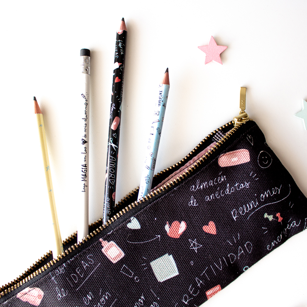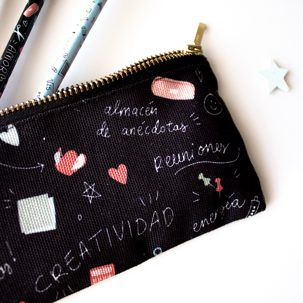 El estuche Corazón de Maestra en negro es ideal para llevar todas tus herramientas de maestr@ y profe. Un diseño cuidado y la palabra Corazón de MAESTRA en etiqueta color rosa.