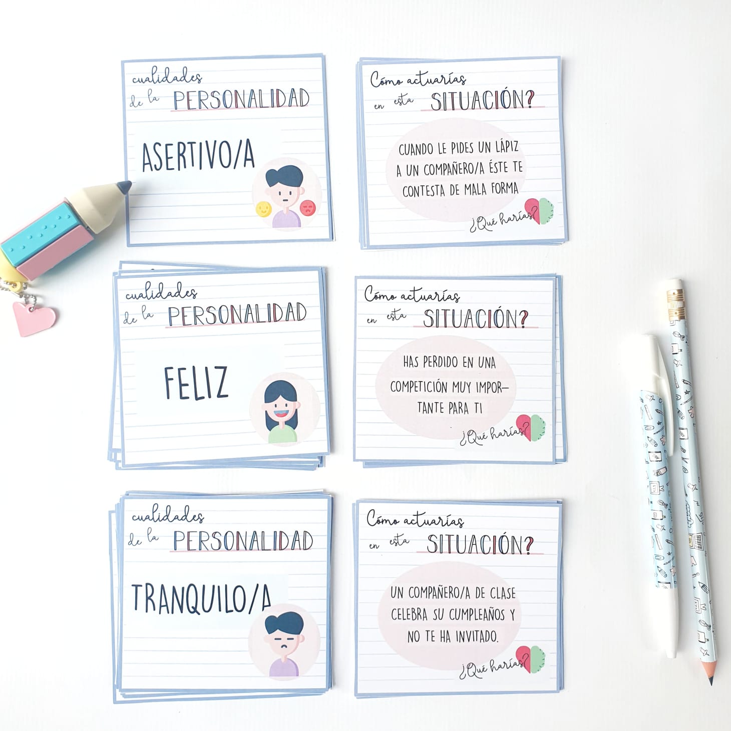 - cartas de personalidad: se incluyen diferentes personalidades como tímid@, amable, insegur@, feliz..