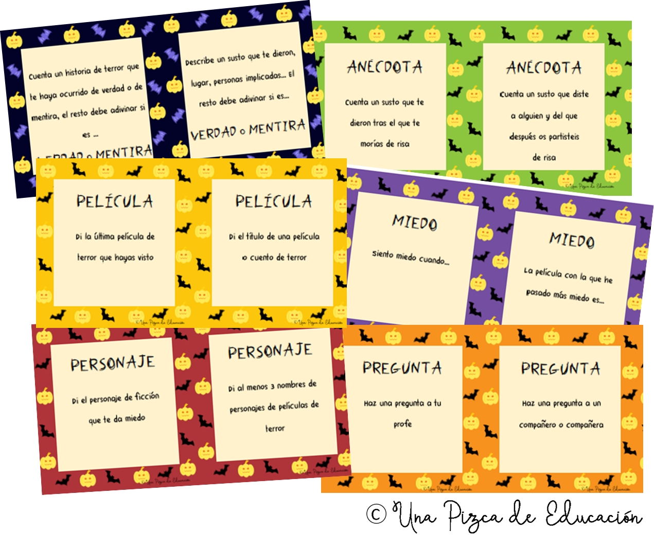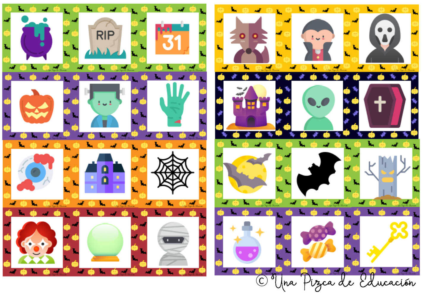 - Tarjetas de imágenes monstruosas: se incluyen más de 30 tarjetas con diferentes imágenes de terror. Con ellas te proponemos diferentes dinámicas, las encontrarás explicadas en el kit. Historias encadenadas, cuentos con ingredientes, juego memory… ¡Imprímerlas a todo color!