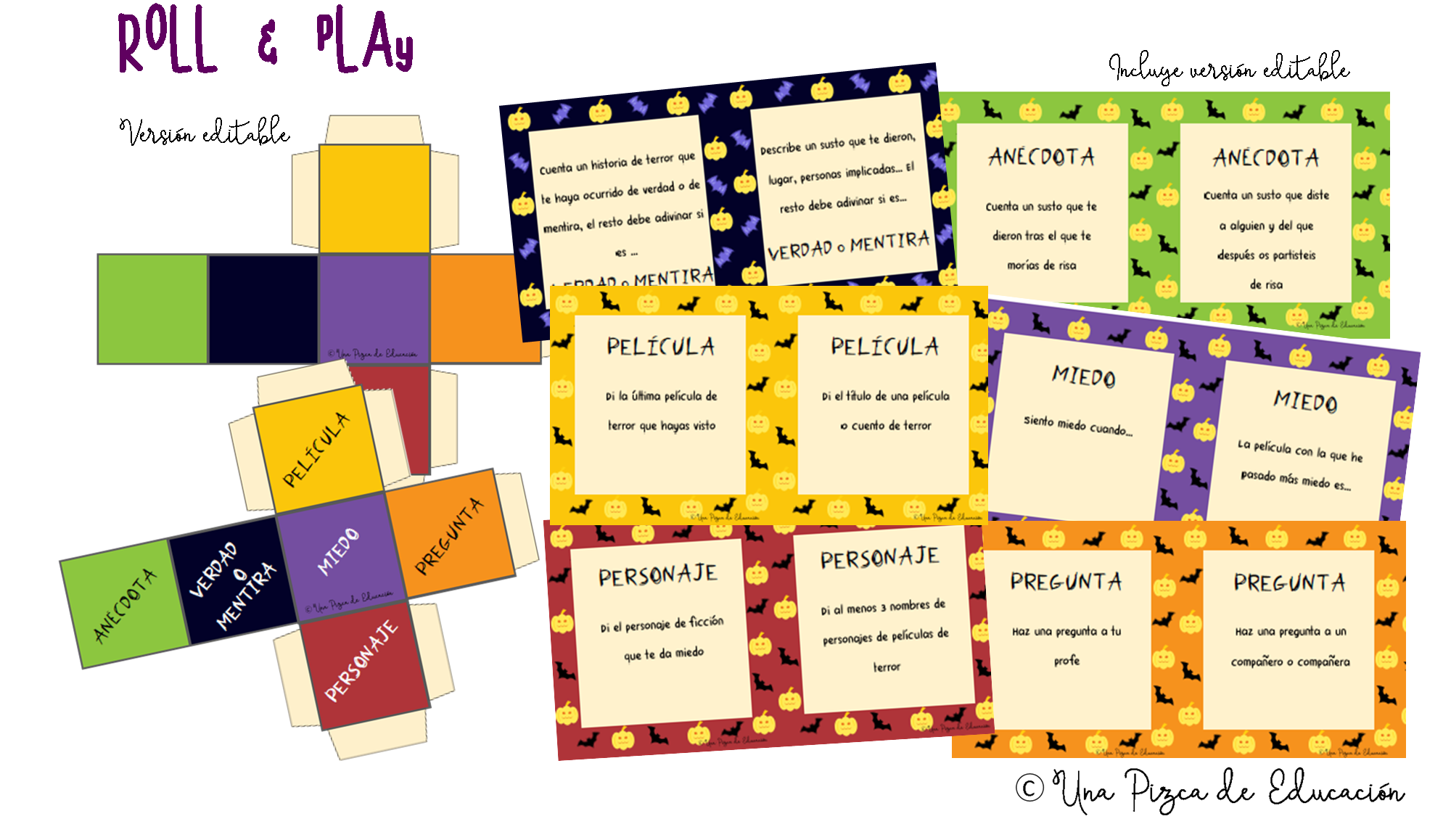 - Roll&Play: Incluye cartas y dado. Este material te servirá para aplicar una dinámica grupal en la que trabajar la expresión oral de tu alumnado. Podrás trabajar en pequeño grupo o en gran grupo. Además puedes ampliar usando nuestras plantillas de escritura y usar las tarjetas para desarrollar la expresión escrita. Se incluye diferentes formatos de dados y versión editable del mismo y de las tarjetas.