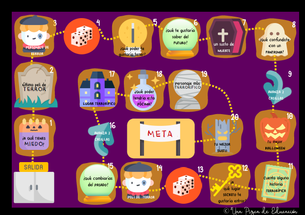- Tablero de juegos: te servirá para seguir desarrollando la expresión oral. Se incluyen dos versionas, una para jugar con fichas y dados y otra para proyectar en la PDF. Puedes jugar en gran grupo o en pequeño grupo.
