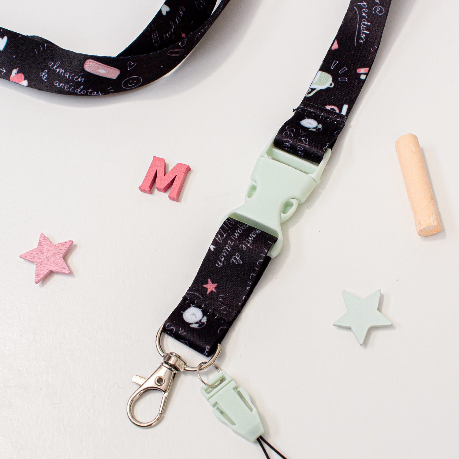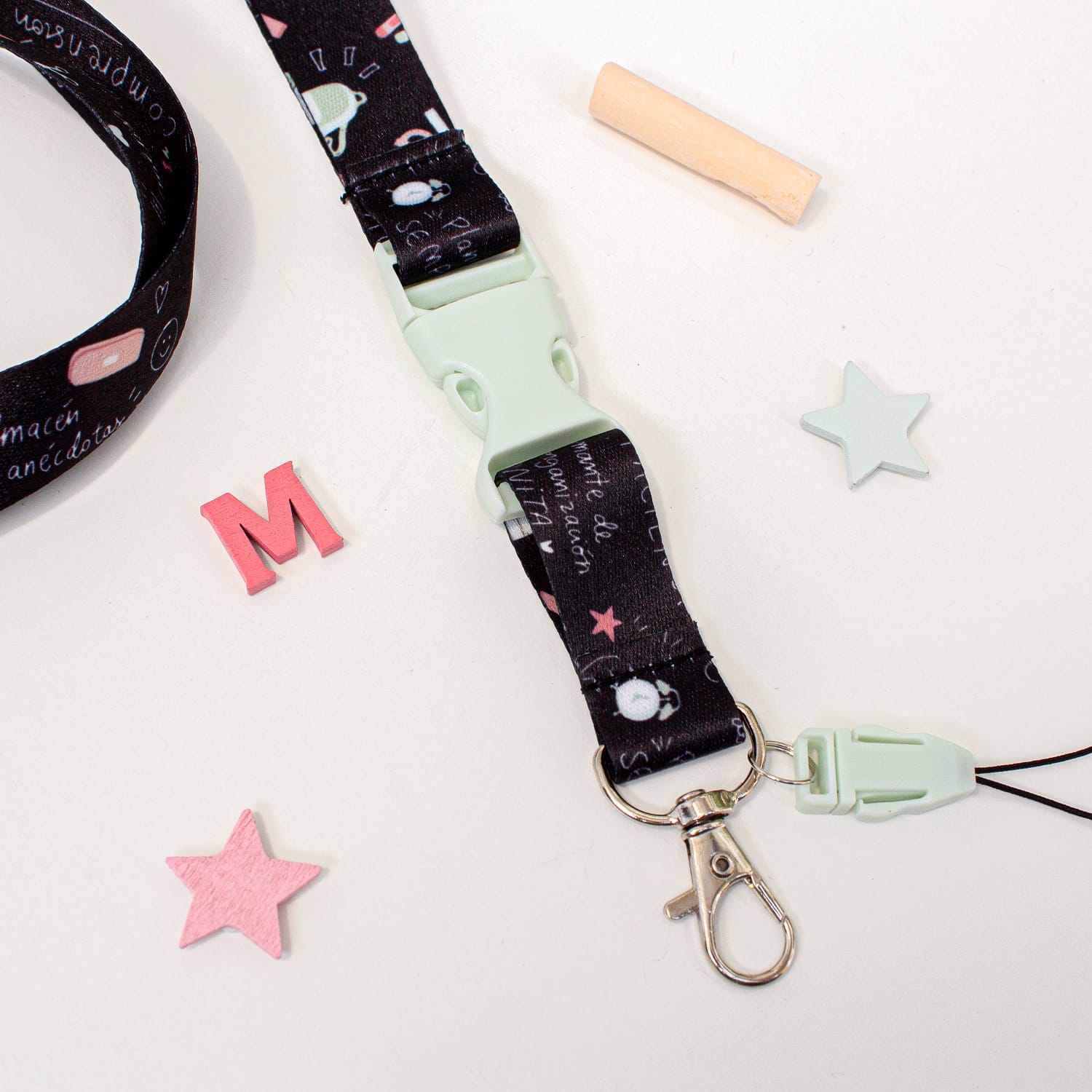 Este lanyard tan original pertenece a la nueva colección corazón de maestra, a juego con los motivos del cuaderno 24/25. Con cinta de 2cm de ancho y sublimado a dos caras. Incluye hebilla de plástico verde menta que te permitirá separar las llaves del mismo lanyard. También incluye cierre en la parte trasera del mismo.