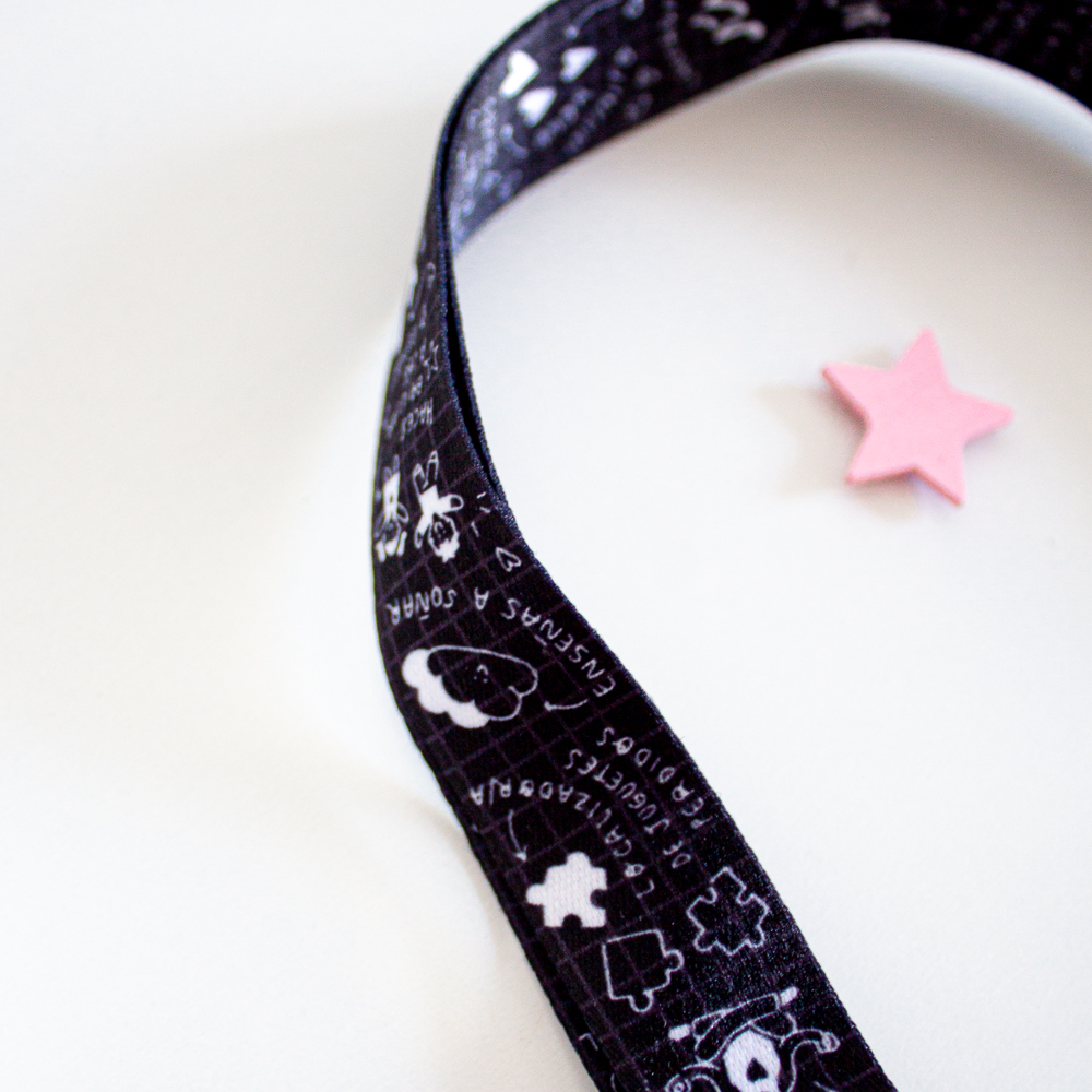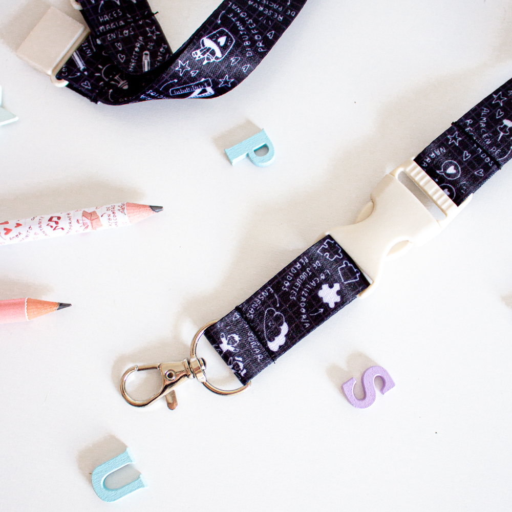Con un diseño único con motivos escolares y fondo negro. Su cinta es de 2cm de ancho y sublimado a dos caras. Incluye hebilla de plástico rosa que te permitirá separar las llaves del mismo lanyard. También incluye cierre en la parte trasera del mismo.