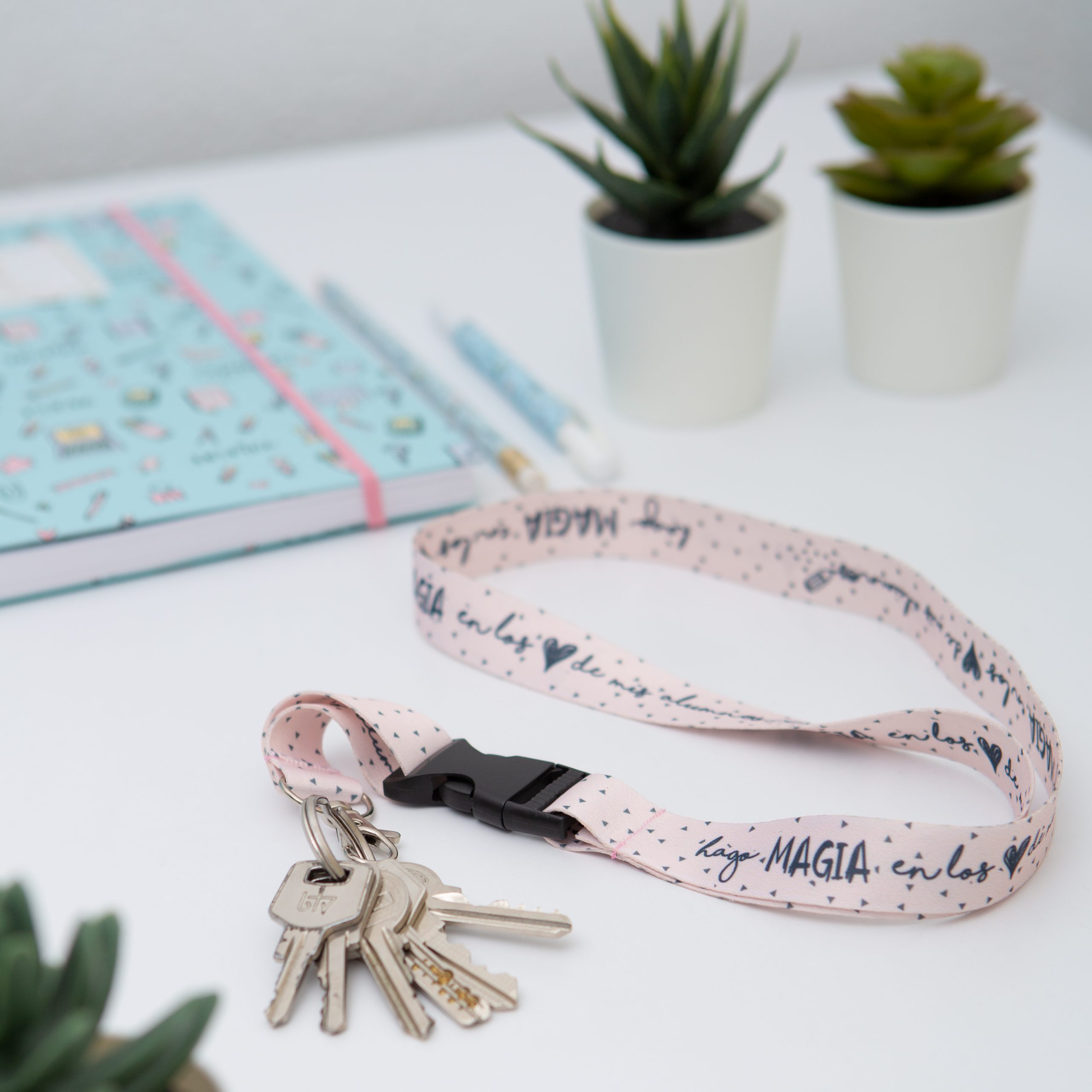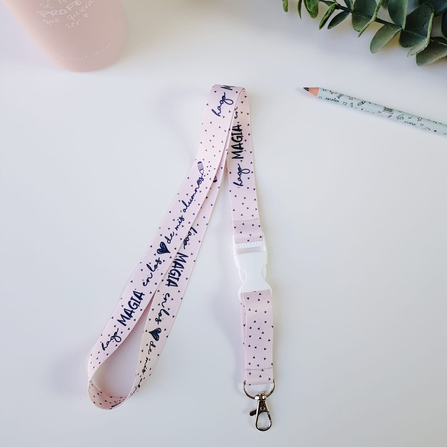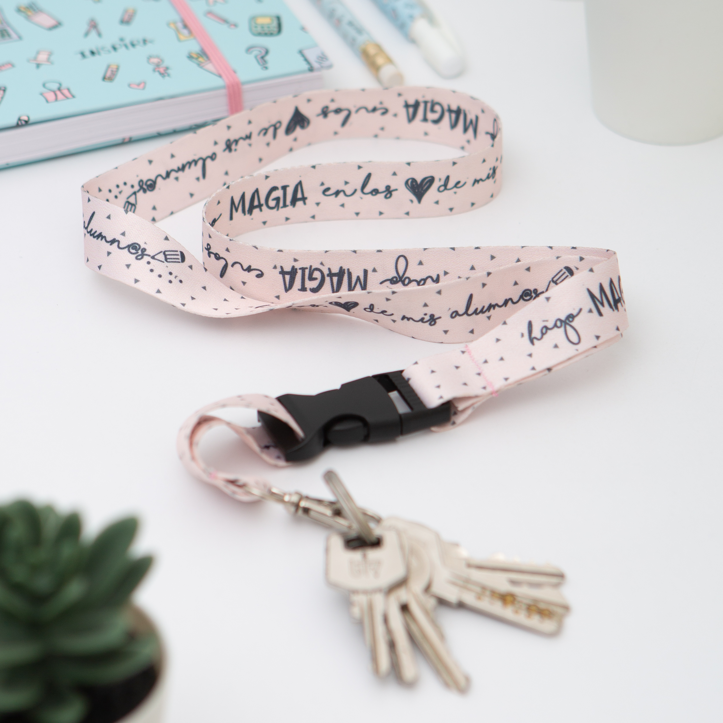 El lanyar hago magia en los corazones de mis alumn@s es ideal. Con cinta de 2cm de ancho y sublimado a dos caras. Incluye hebilla de plástico negro o blanca a elegir, que te permitirá separ las llaves del mismo lanyard.