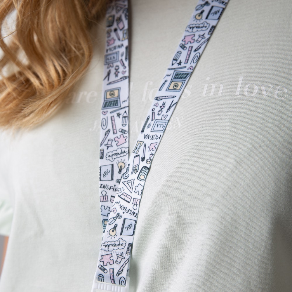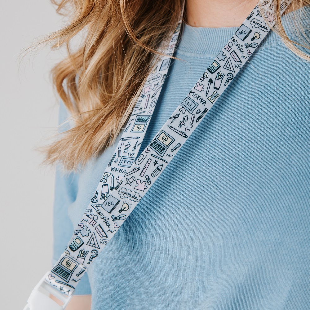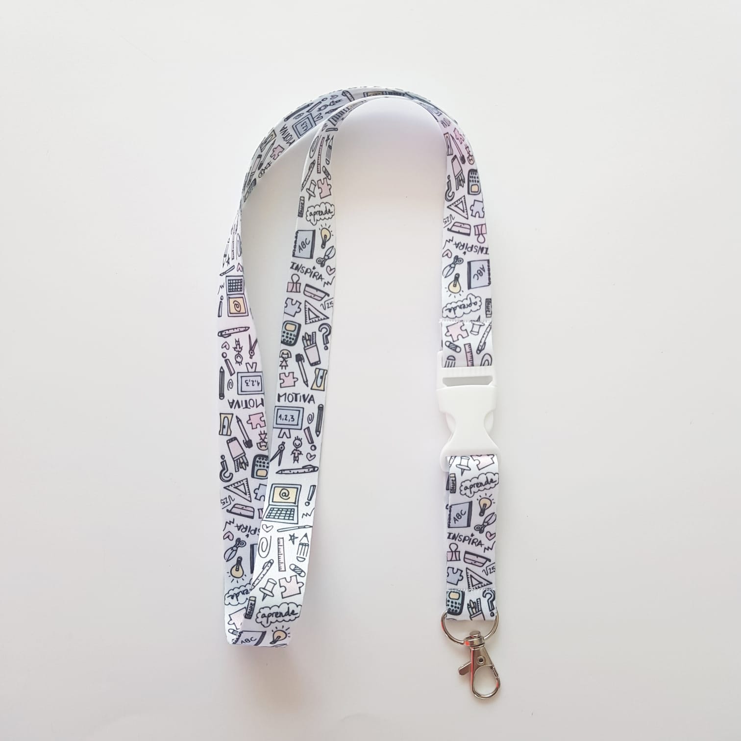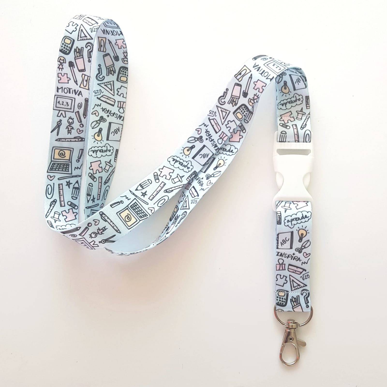 El lanyard para profes de la nueva colección inspira, motiva y aprende tiene un diseño original con motivos escolares. Está impreso en sublimación y contiene una hebilla en color blanco desmontable, para que puedas llevar tus llaves con diferentes opciones.