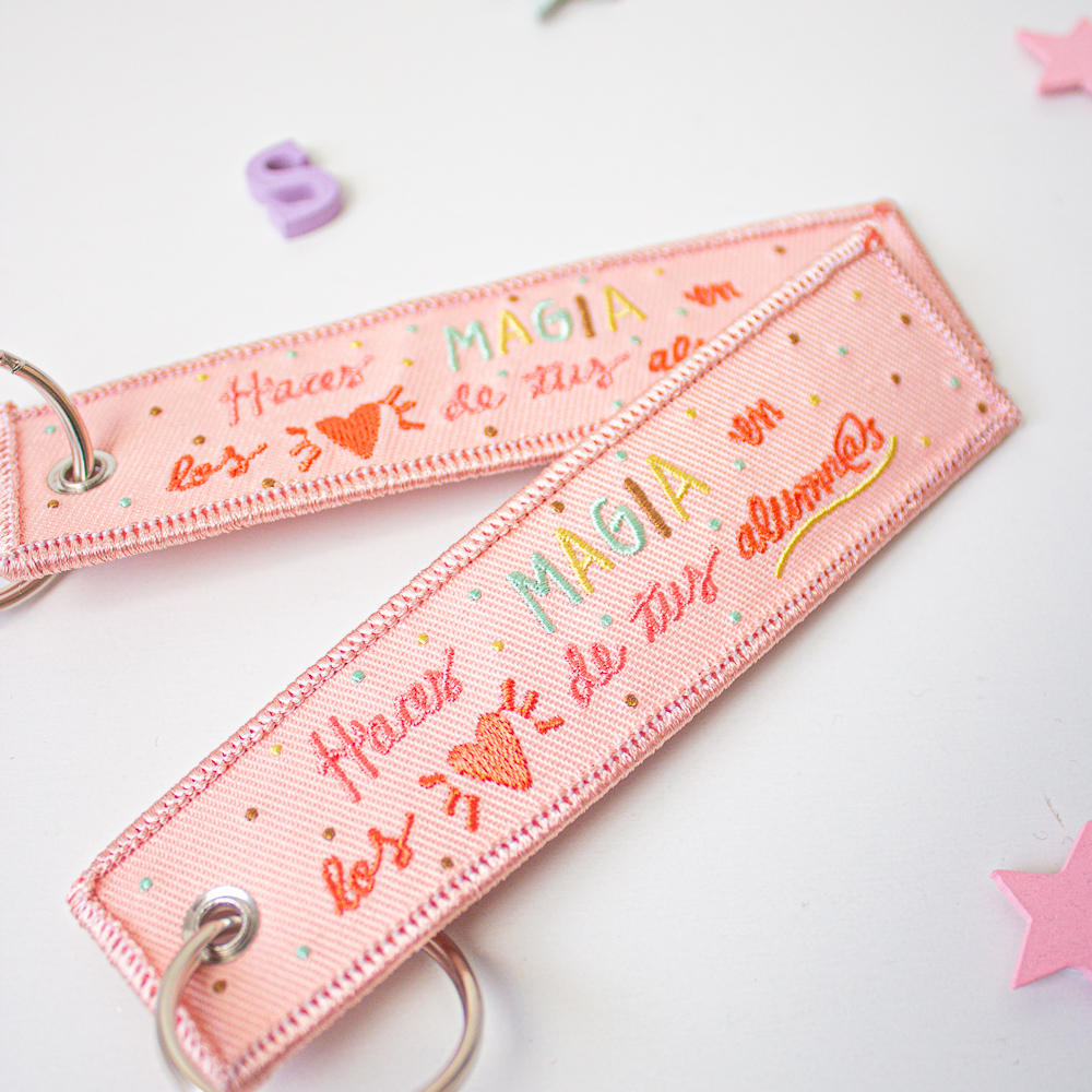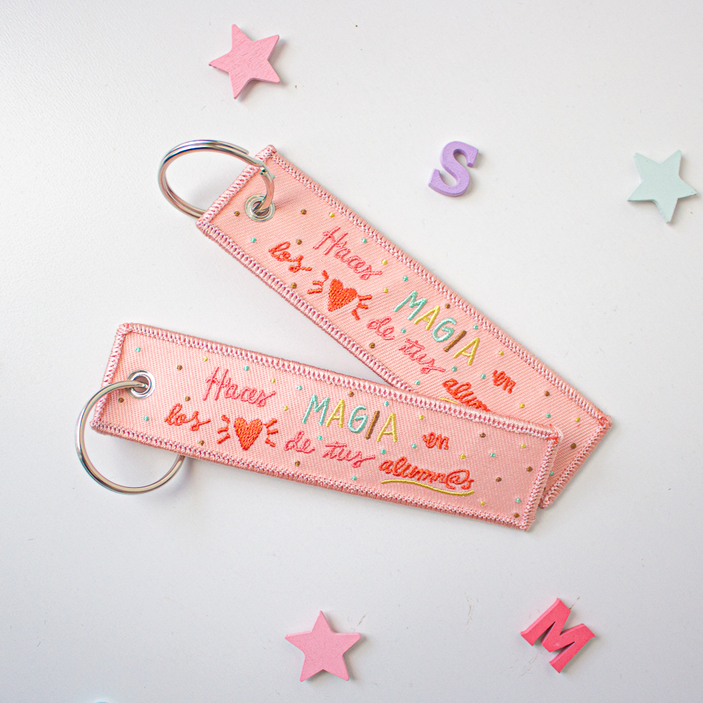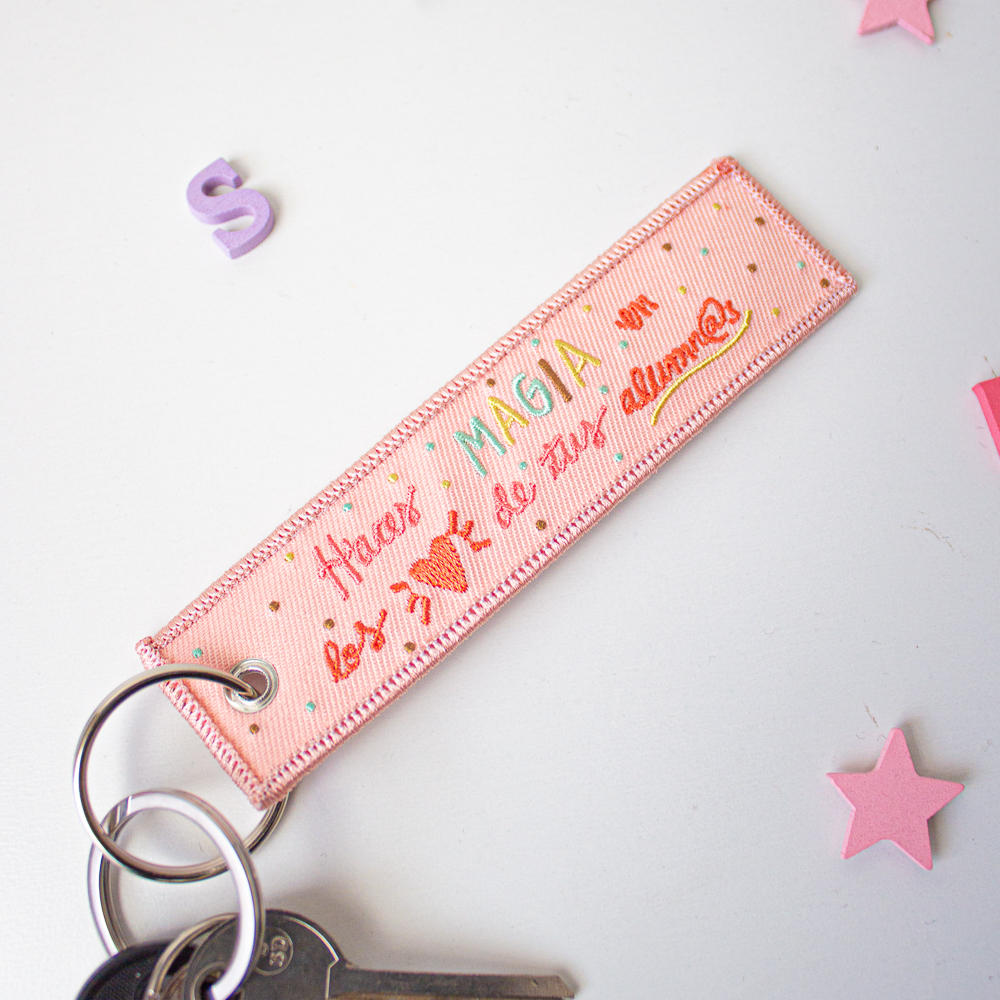 El llavero haces magina en los corazones de tus alumn@s es ideal para llevar tus llaves de aquí para allá y encontrarlas fácilmente. Está fabricado en tela y lleva bordad en ambas caras una de nuestras frases más top.