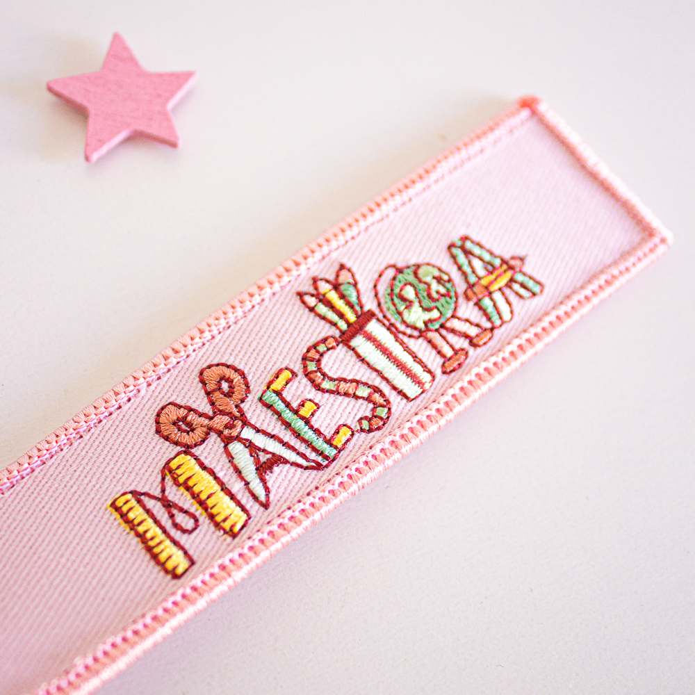 El llavero MAESTRA es ideal para llevar tus llaves de aquí para allá y encontrarlas fácilmente. Está fabricado en tela y lleva bordado en ambas caras la palabra MAESTRA con motivos escolares.