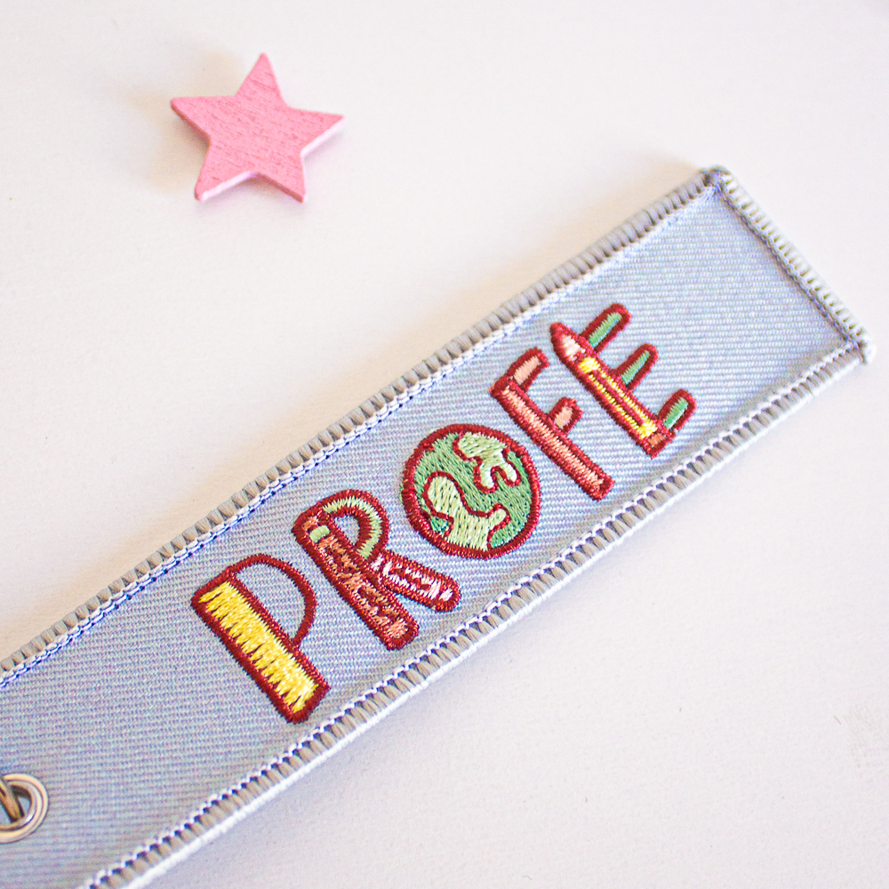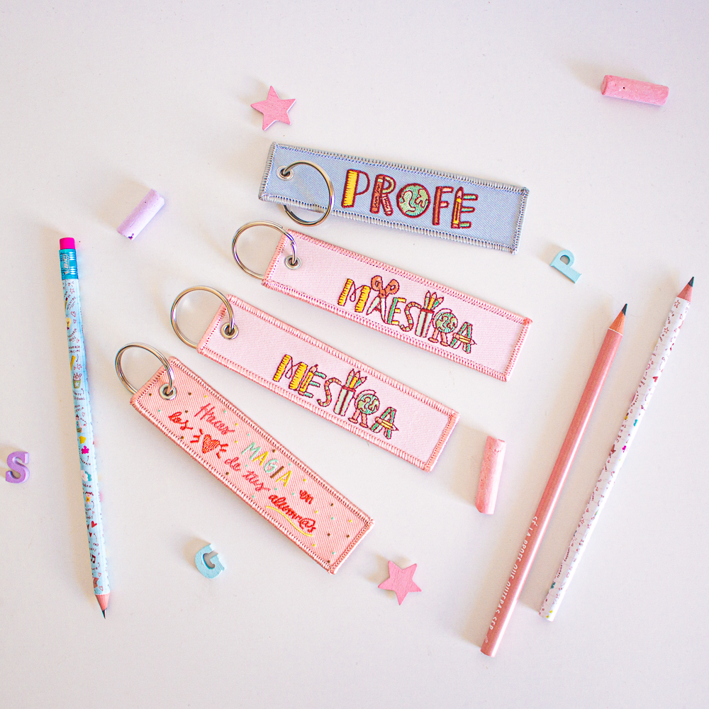 El llavero PROFE  es ideal para llevar tus llaves de aquí para allá y encontrarlas fácilmente. Está fabricado en tela y lleva bordado en ambas caras la palabra PROFE  con motivos escolares.