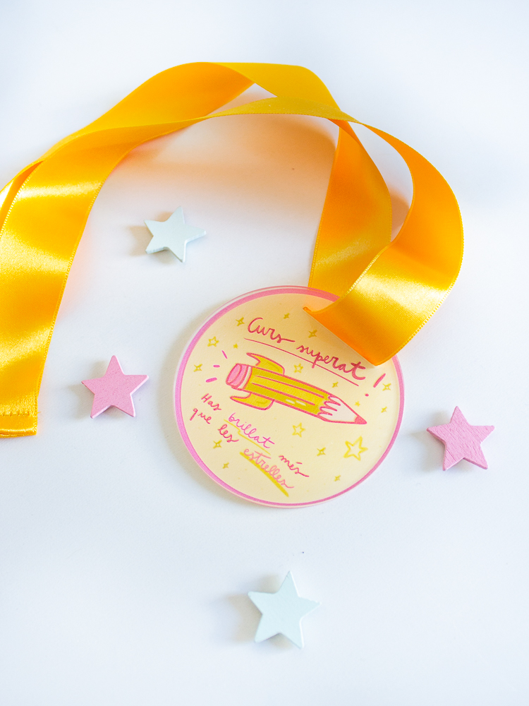 Esta medalla lleva la frase: CURS SUPERAT. Has brillat més que les estrelles.