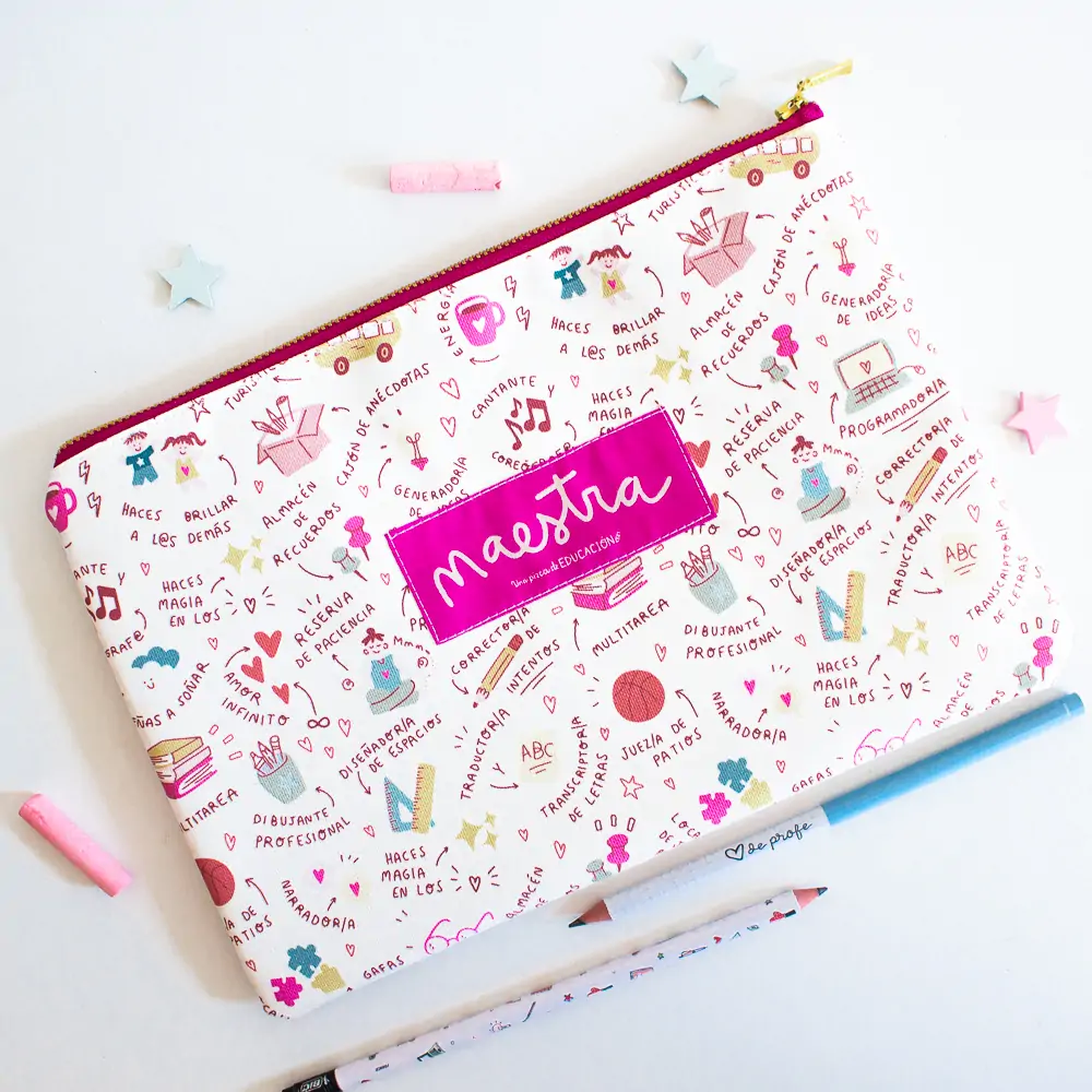 – etiqueta cosida en fucsia con la palabra Maestra.