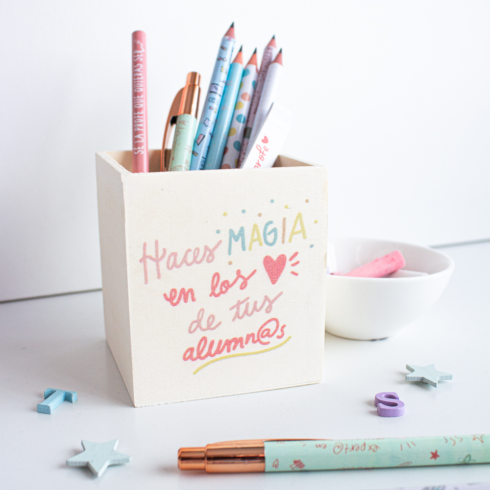 El portápices está fabricado en madera y estampado a color, con la frase que tanto nos gusta «haces magia en los corazones de tus alumn@s»