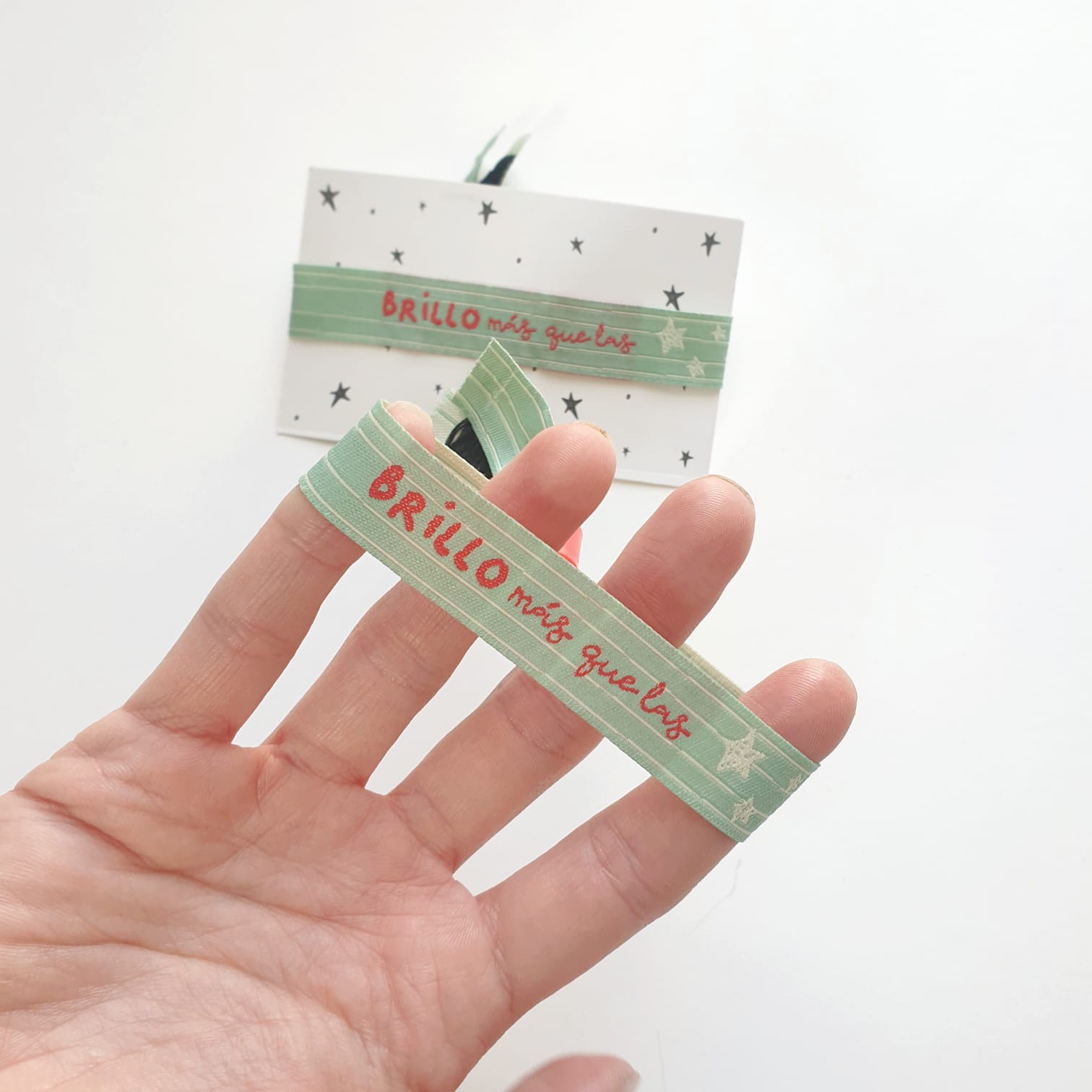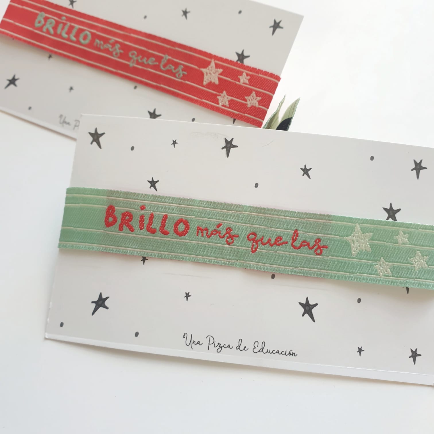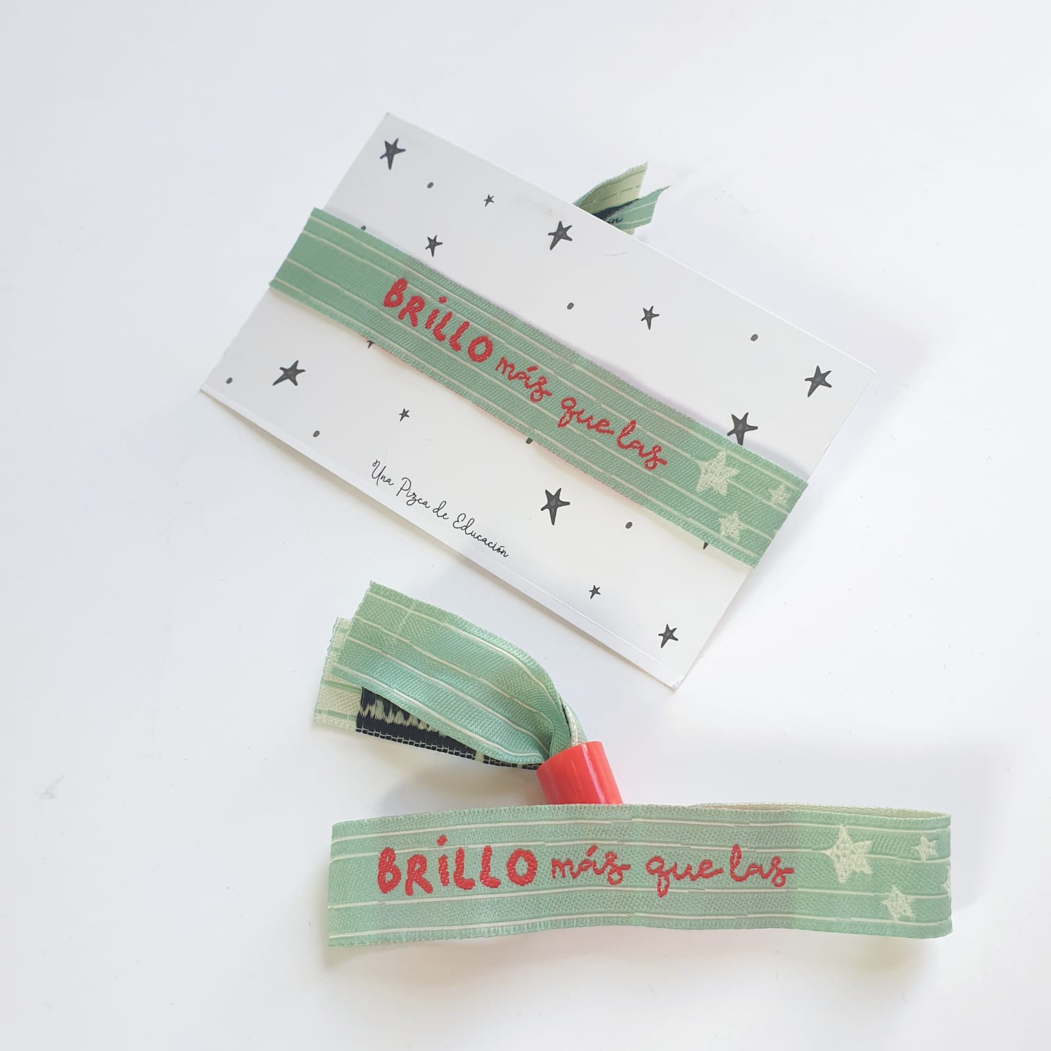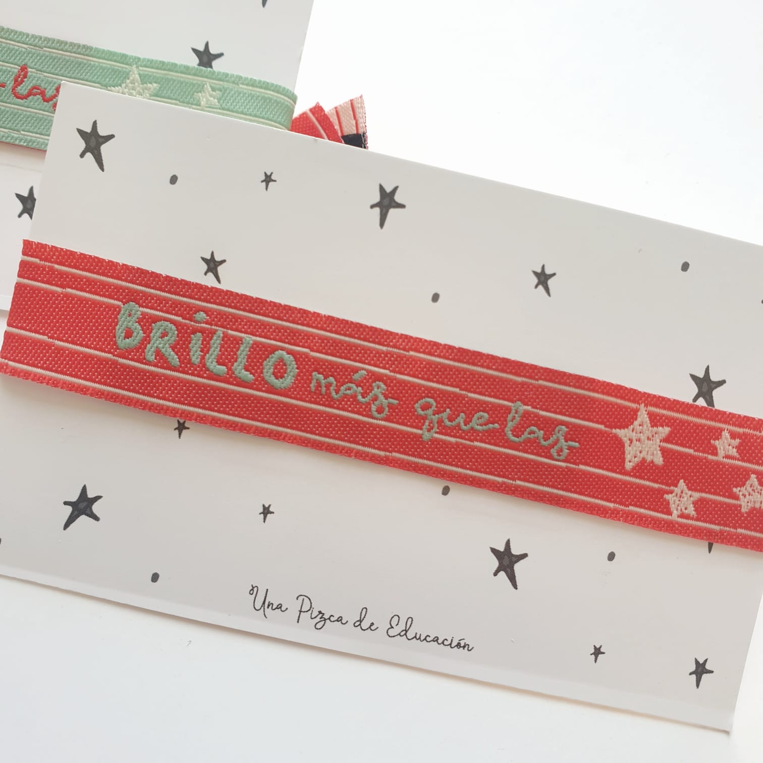 La pulsera Brillo más que las estrellas  es el detalle ideal para tu alumnado o tus compañeros. Se trata de una pulsera de tela bordada de 1,5 cm de ancho. Incluye cierre de plástico de color rojo. Puedes escoger entre dos colores diferentes: rojo o verde.
