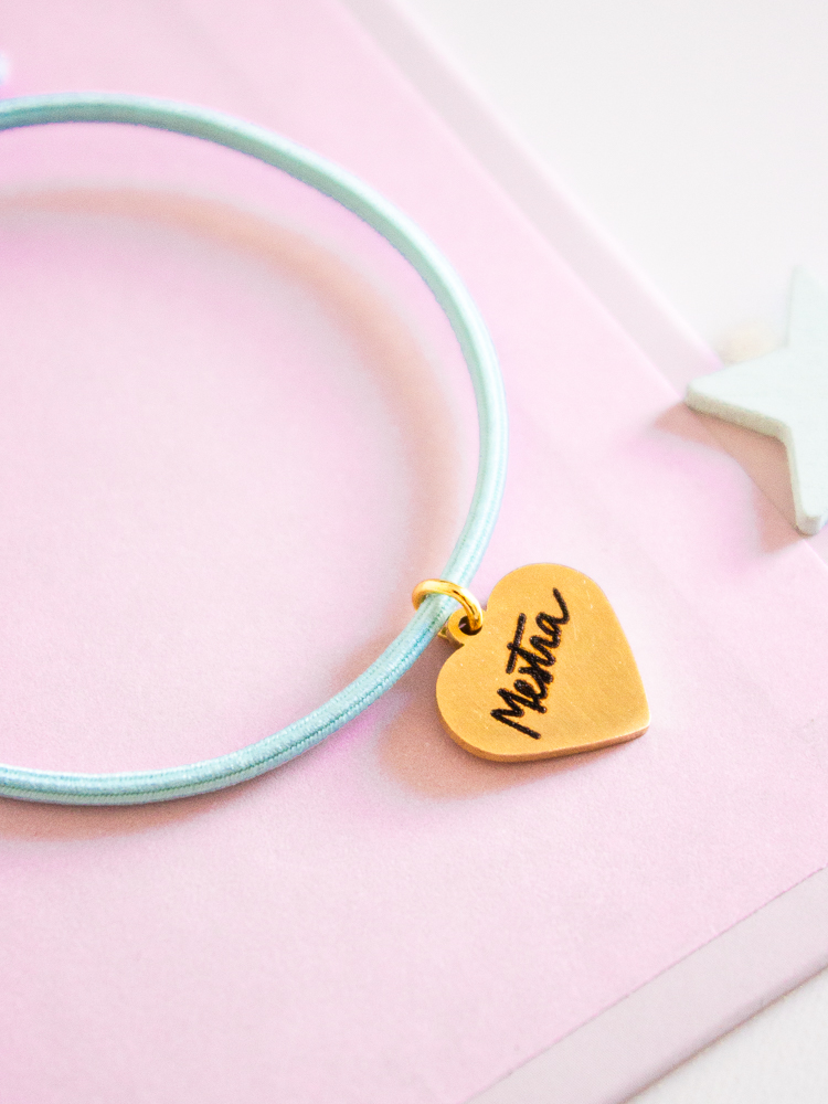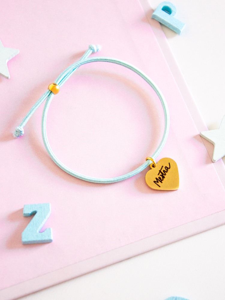 La pulsera maestra ideal para tener un detalle con esa maestra especial o contigo misma. Sabemos que los detalles son importantes y esta pulsera lo es.  Está hecha con cordón elástico y lleva un charm dorado en forma de corazón con la palabra MESTRA grabada.  Puedes escoger entre dos colores. También disponible en castellano.