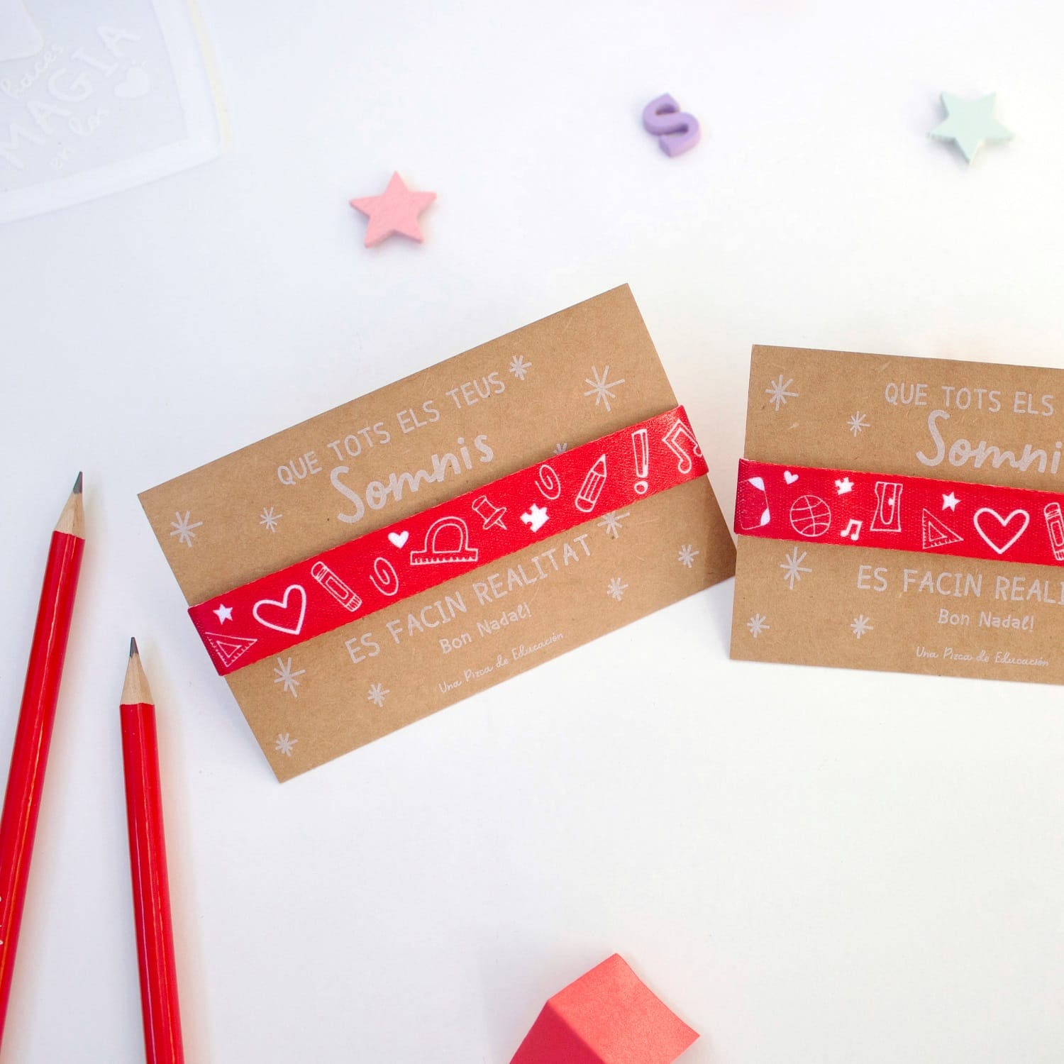 La pulsera motivos escolares es el detalle ideal para tu alumnado o tus compañeros. Se trata de una pulsera de tela sublimada con motivos escolares de 1,5 cm de ancho. Incluye cierre de plástico de color blanco. Puedes escoger el cartón entre dos idiomas diferentes: castellano o valenciano/catalán.