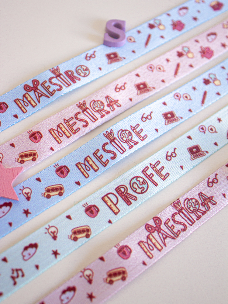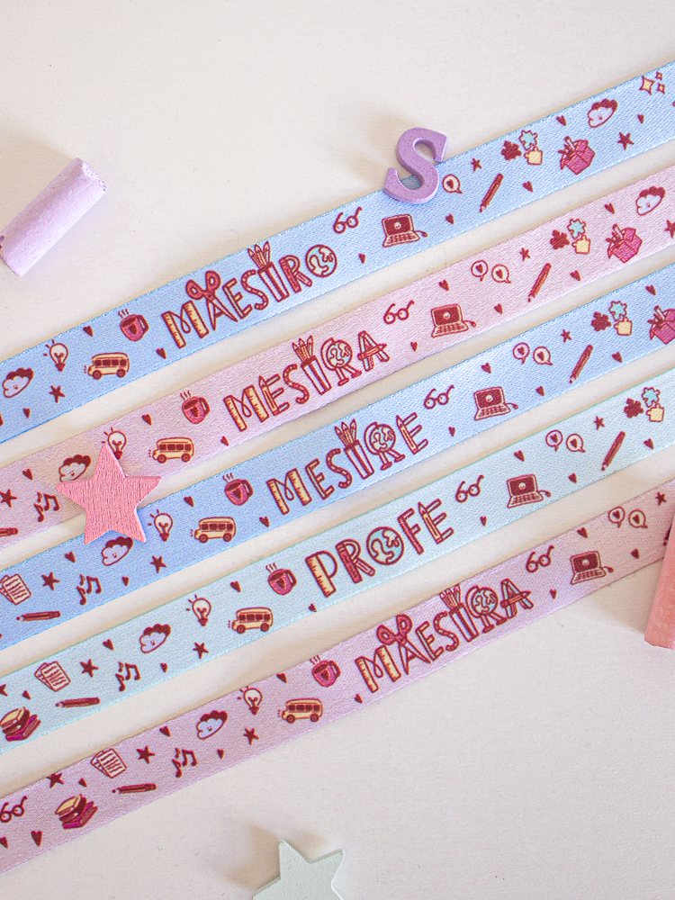 Se trata de una pulsera de tela sublimada a todo color con motivos escolares de 1,5 cm de ancho. Incluye cierre de bambú.