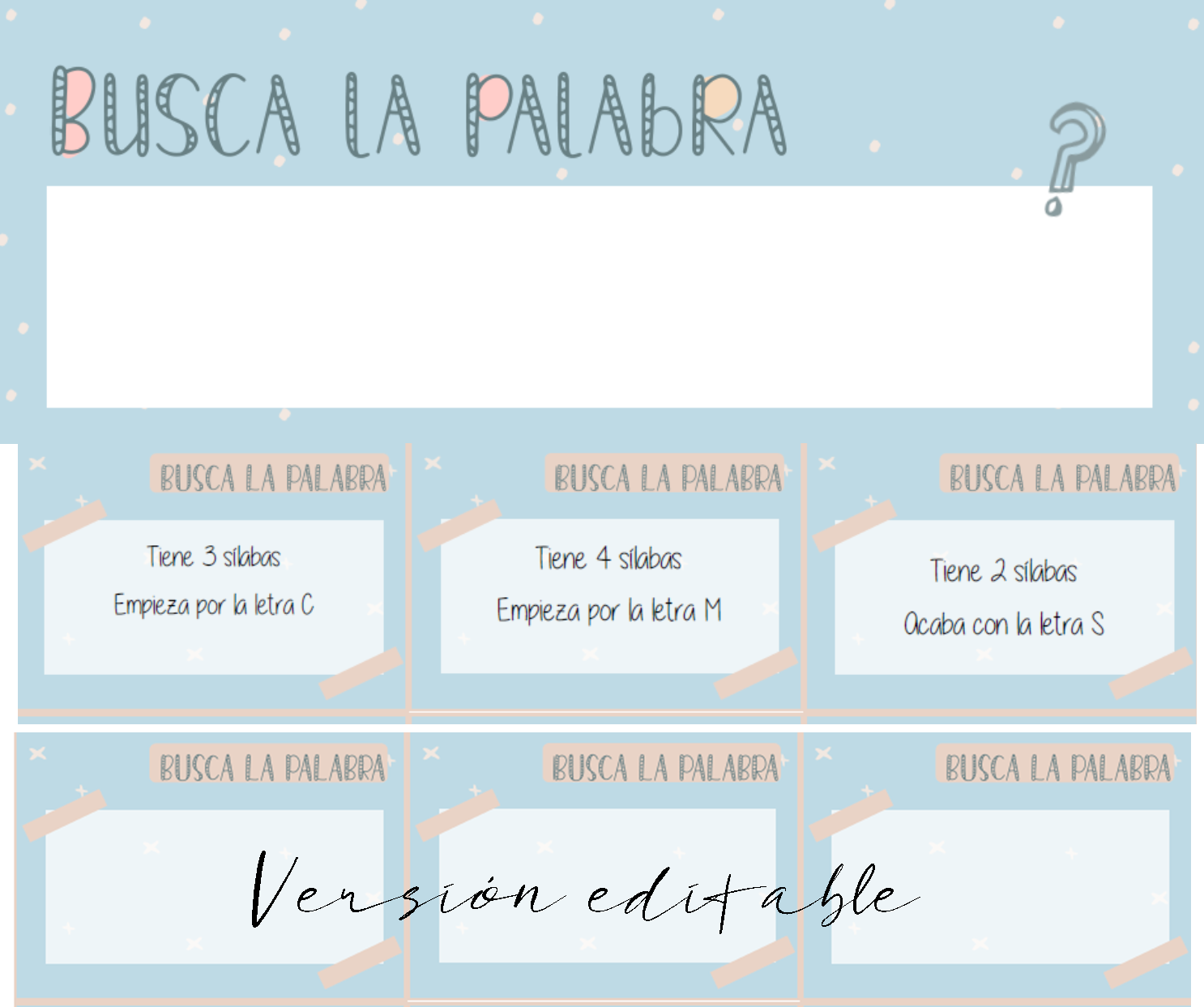Te dejamos unas cartas con consignas que debe cumplir la palabra a buscar. Pueden escribirse una palabra o varias en la plantilla. Además de las tarjetas que te ofrecemos, encontrarás la versión editable de las mismas. Esta versión te permitirá crear tus propias tarjetas, incluyen aquello que te interese trabajar: acentuación, nº sílabras, palabras derivadas…