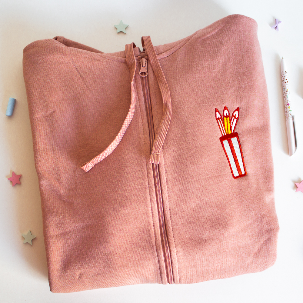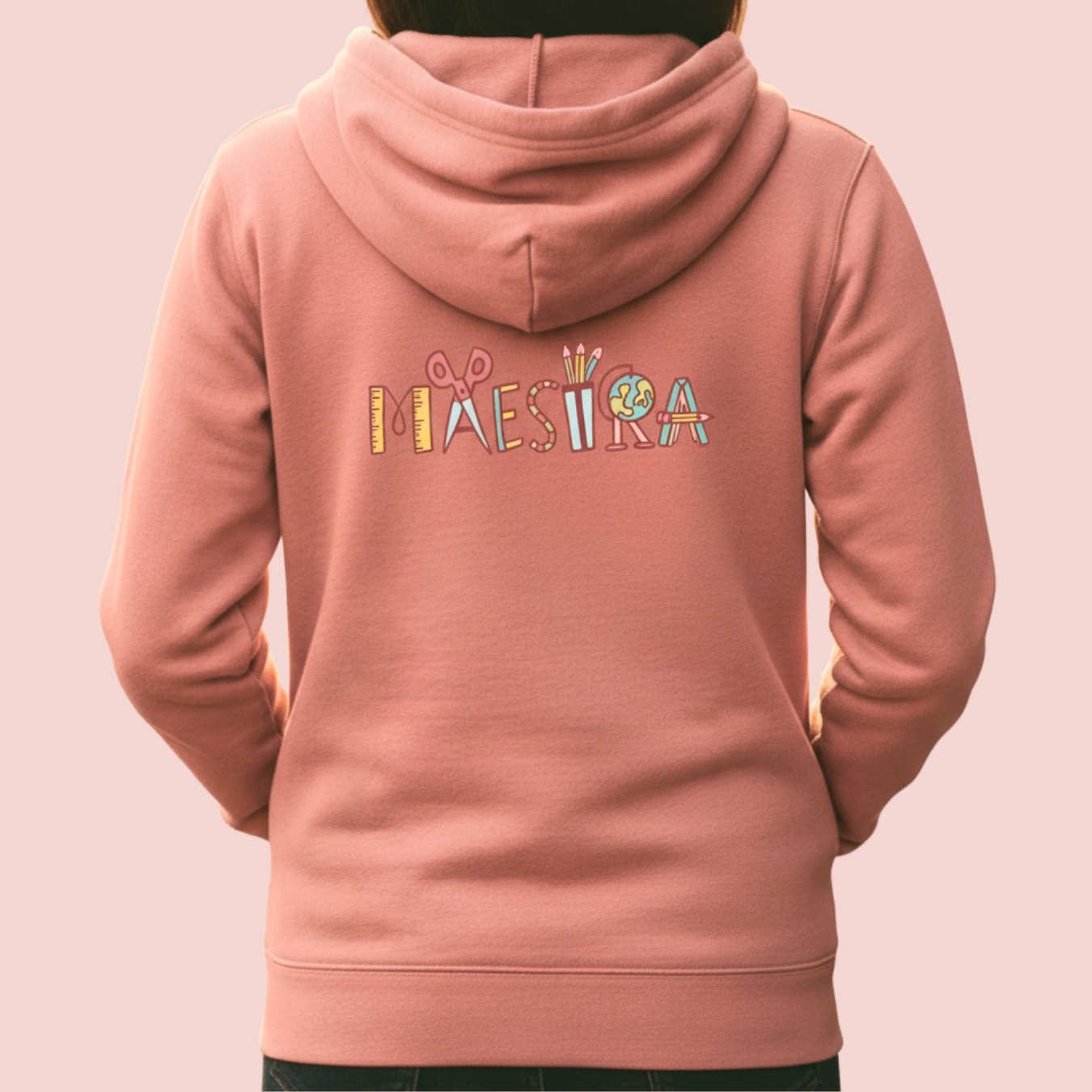 La sudadera con creamallera MAESTRA es ideal para llevarla contigo en el cole. Te permitirá estar bien calentita en clase, el patio, los pasillos… porque sabemos que a veces no echaríamos una capa más en nuestro día a día, y otras veces nos sobra todo. Al ser una sudadera con cremallera te permitirá sacar y poner fácilmente. Además, viene un un diseño bordado delante y por detrás.