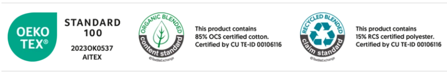 • 85% Algodón orgánico RingSpun – 15% Poliéster reciclado. 300 g/m².