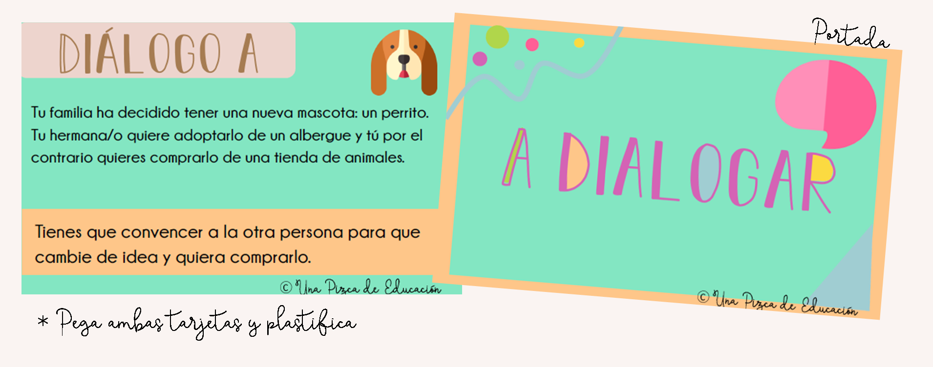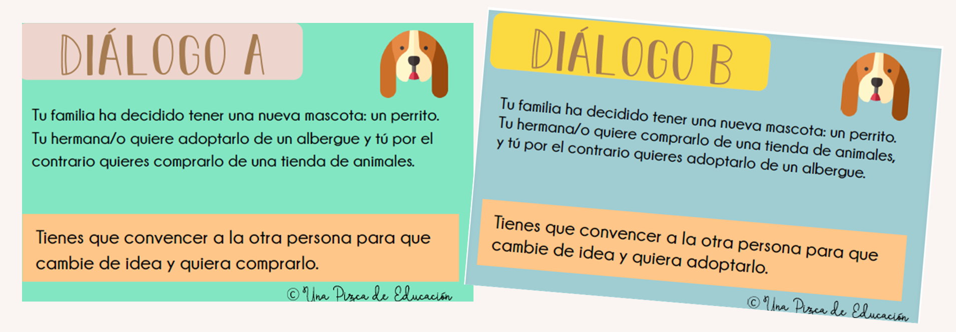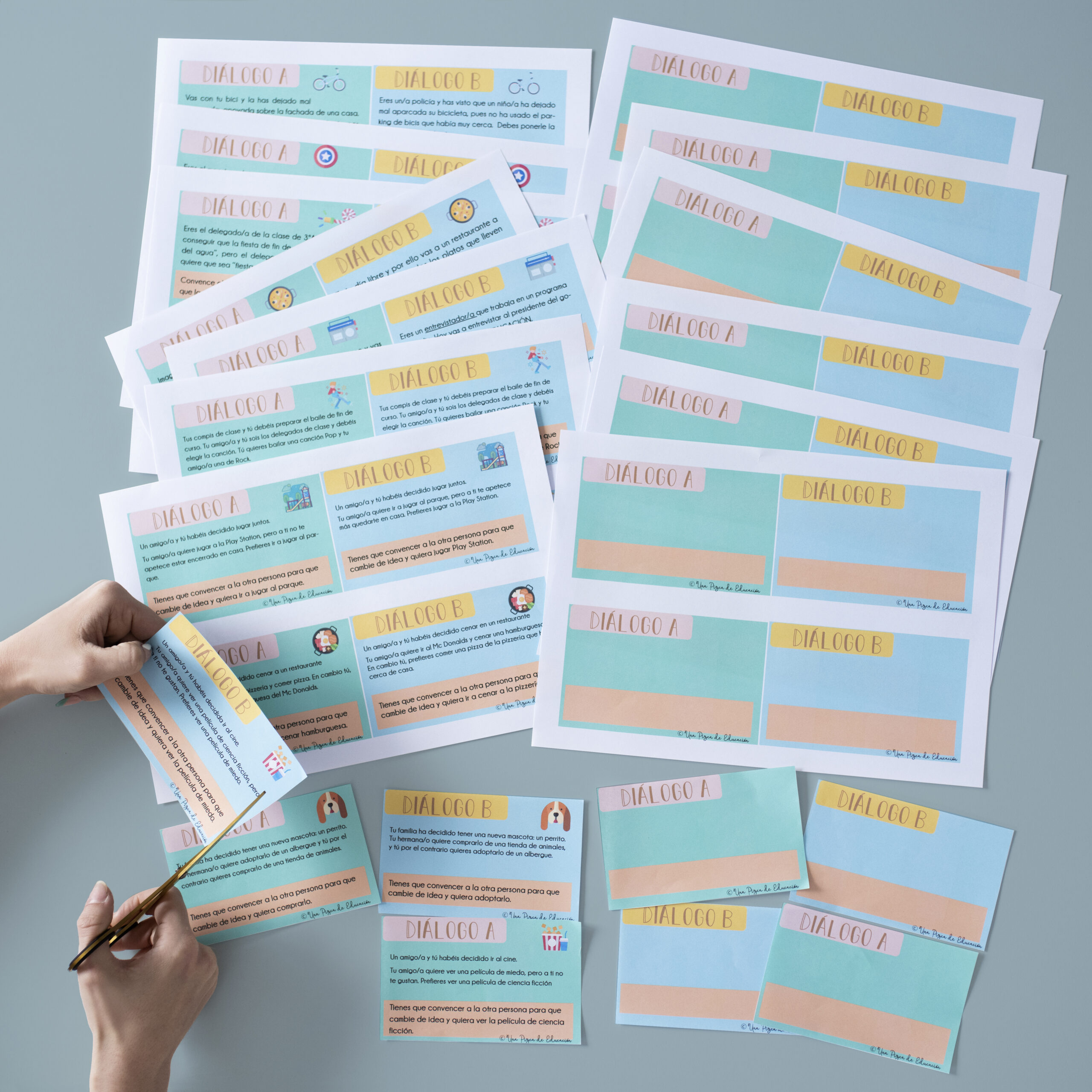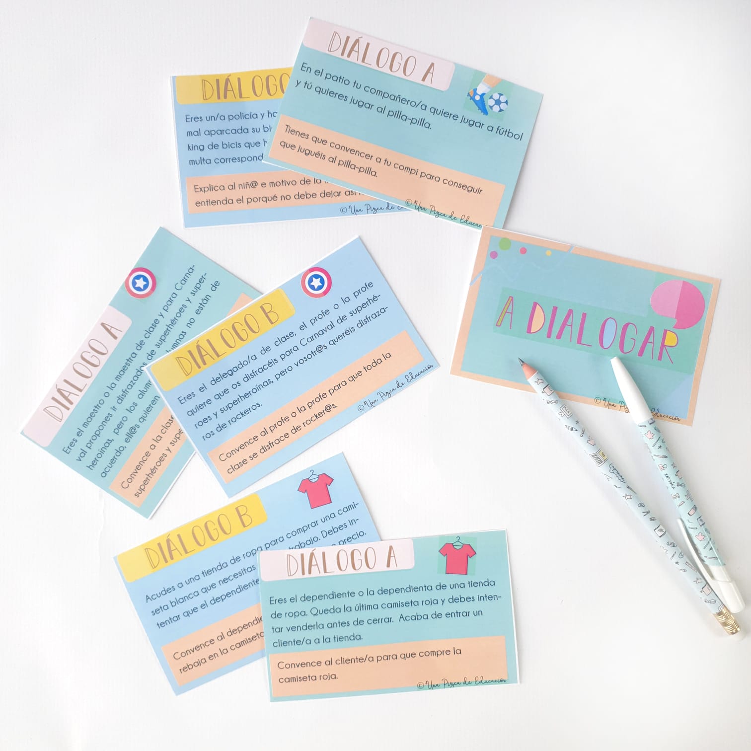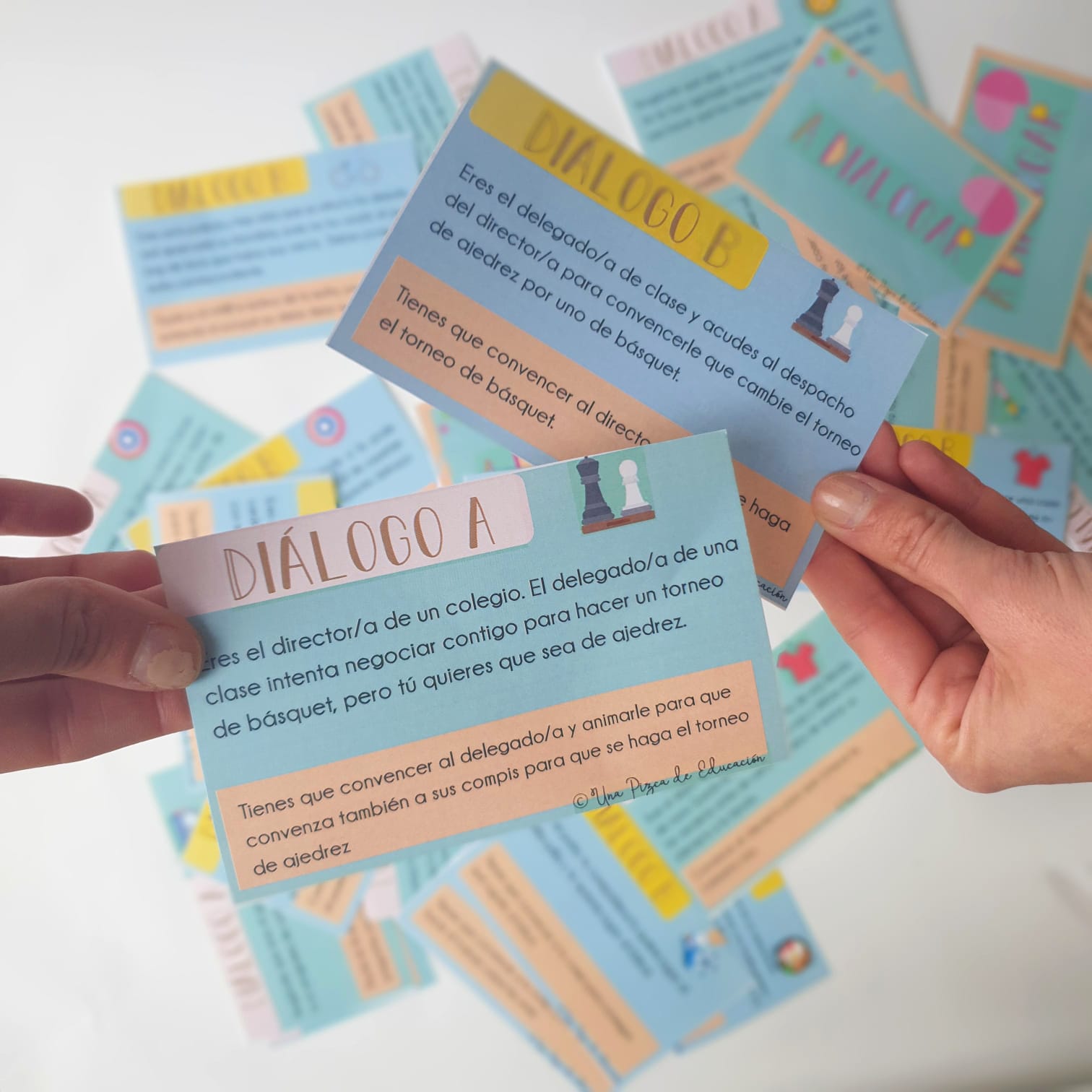Las tarjetas de diálogo están formadas por diferentes situaciones en las que encotrarás un diálogo A y un diálogo B. Hay un total 16 parejas de diálogo (A y B) a través de las cuáles, cada alumn@ representa un papel. Con esta dinámica, amb@s deberán dialogar para llegar a un acuerdo.