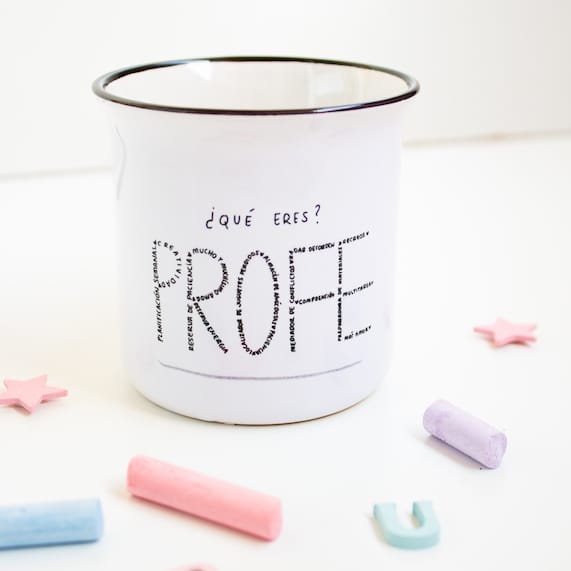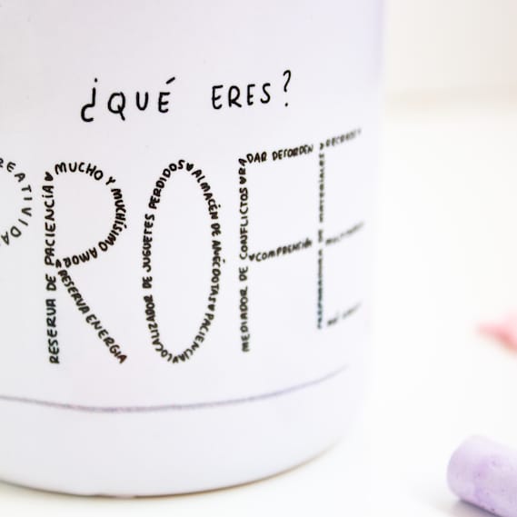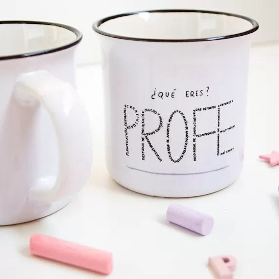 La taza de cerámica ¿Qué eres? PROFE es ideal para regalar a es@ profe o maestr@ tan especial. O incluso para darte un capricho y disfrutar de café o té con una taza bonita.