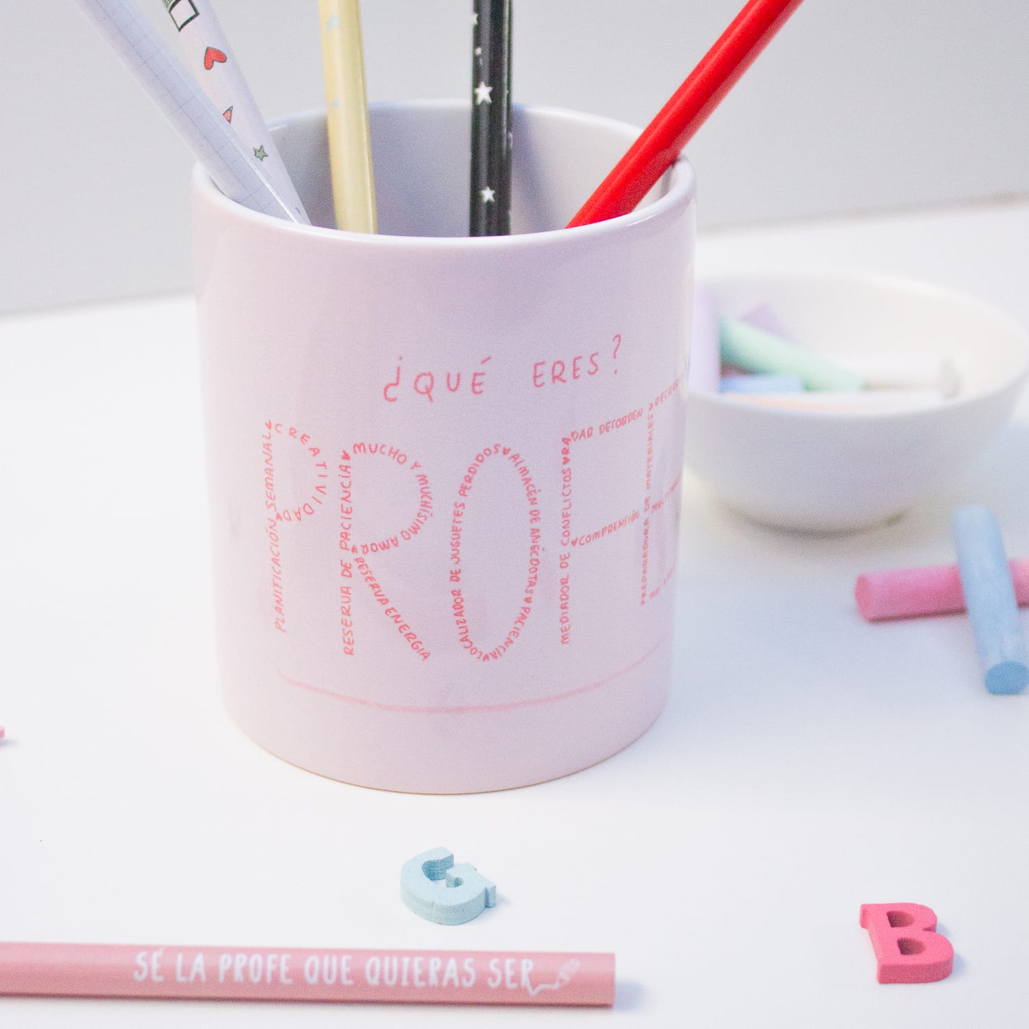La taza ¿Qué eres? PROFE es el detalle perfecto para esos profes que lo dan todo. La palabra PROFE está formada con todas esas cualidades que nos definen.